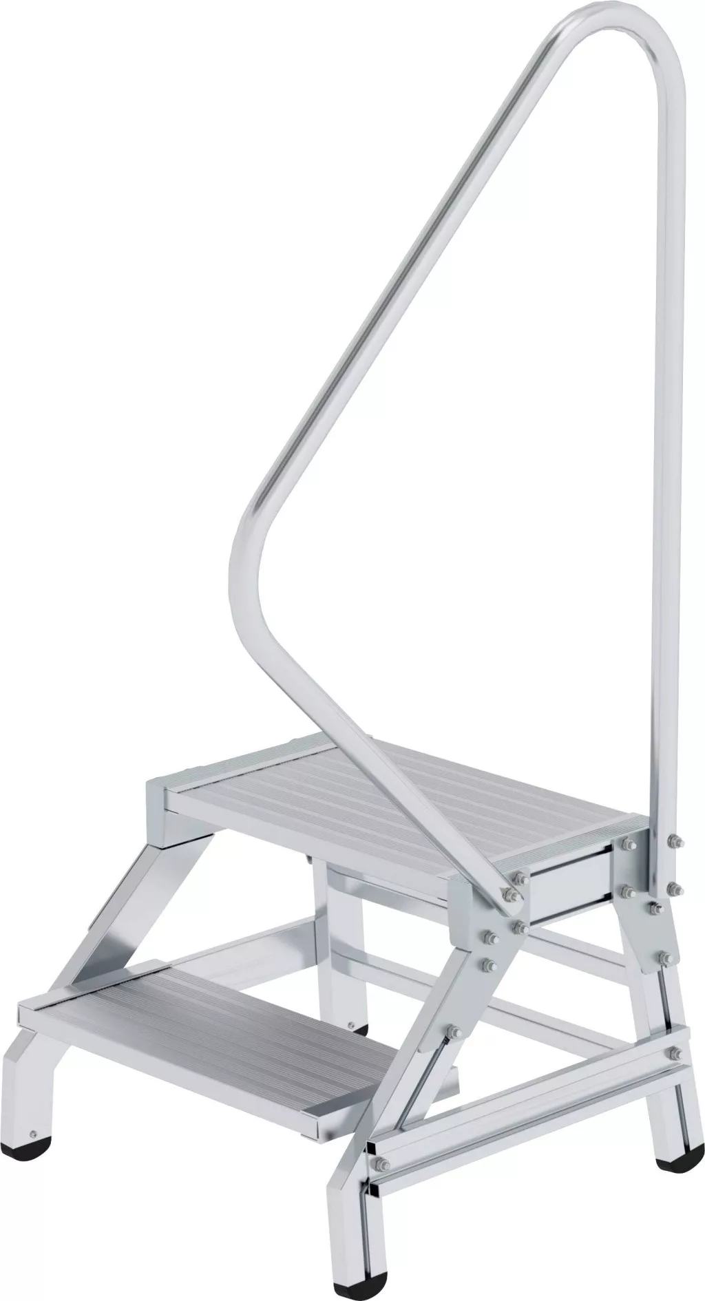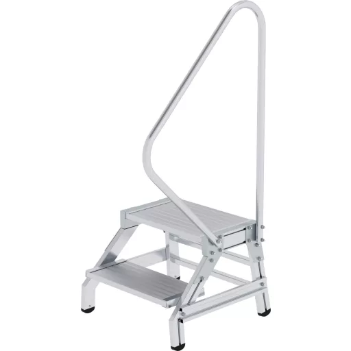 Összeszerelési lépés alumíniumból Különösen stabil konstrukció téglalap alakú csőkarókból Mély lépések és nagy lépcsős felület hullámosítással a biztonságos állványhoz Csúszásmentes műanyag cipő Opcionális rugófékgörgők könnyű mozgatni egyik helyről a másikra Könnyű összeszerelés (szállítás szétszerelve) Felső lépcsőfelület: 500 x 300 mm terhelés Max. 300 kg fokozott biztonság az egyoldalas korláton keresztül. Ez lazán van bezárva és könnyen csavarozható (lyukak a jobb oldalon)