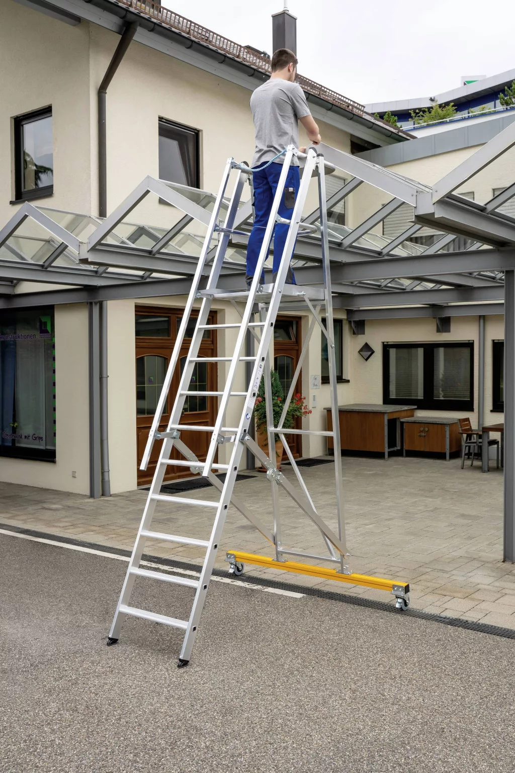 Alumínium állólétrák Stabil téglalap alakú csövek, 80 mm mély, hullámos lépcsők Nagy, csúszásmentes munkaállvány (650 x 600 mm) 4-szeres lépcsők / Spar csatlakozás mindkét oldalán korláttal, háromoldalas korláttal, térdkorláttal és biztonsági kötéllel a biztonságos járásért és az álló helyzethez köszönhetően Az acél zsanérok a helytakarékosság érdekében összehajthatók. Támasztó alkatrész stabilizáló kereszttartóval a nagy stabilitás érdekében Integrált rögzített görgők Ø 125 mm-es reteszelő szerkezettel a hely gyors megváltoztatására, ha a szabadalmaztatott 2 tengelyes dőlésszögű nivello® létracipő kibontakozik. Nagy szerszámtárolás Külső szélesség: 650 mm (keresztirány nélkül) Lépéstávolság: 235 mm létra dőlésszög: 70 ° Maximális terhelés: 150 kg