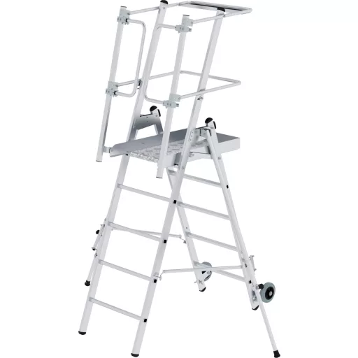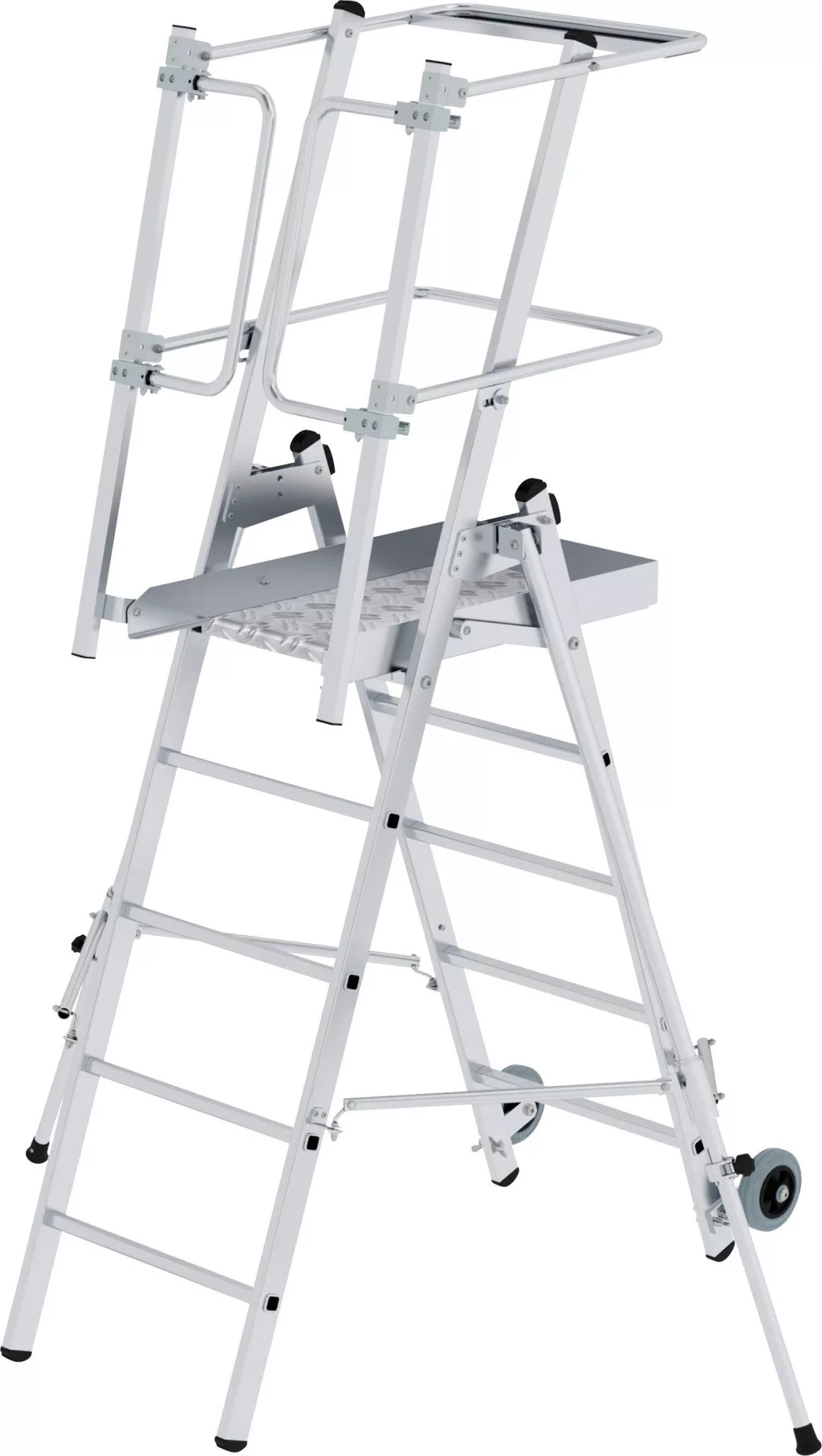 Alumínium állólétrák Erős, téglalap alakú csövek. Négyzet alakú bordák, 30 x 30 mm, mindkét oldalán hullámosítva. Tágas platform hullámosított alumínium ellenőrző lemezből (480 x 655 mm). A szórókeretek mindkét oldalán folyamatosan állíthatók. Önzáró biztonsági ajtó Nagyméretű szerszámtárolás Beépített görgők Ø 125 mm és praktikus összecsukható mechanizmus a hely gyors változtatásához. Rugalmas teleszkópos alkatrészekkel vagy anélkül