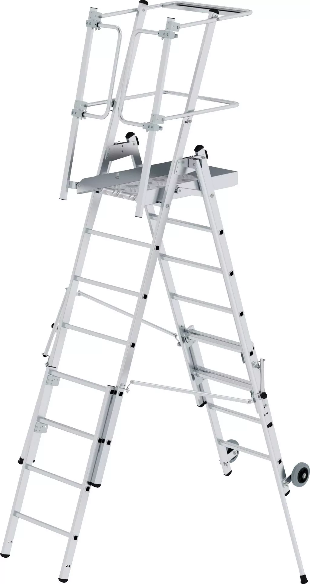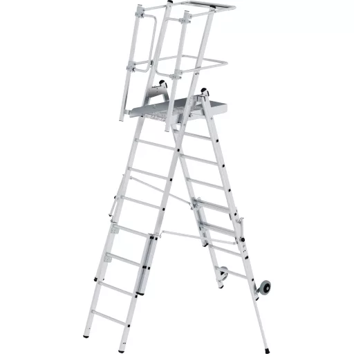 Alumínium állólétrák Erős, téglalap alakú csövek. Négyzet alakú bordák, 30 x 30 mm, mindkét oldalán hullámos. Tágas platform hullámosított alumínium ellenőrző lemezből (480 x 655 mm). Önzáró biztonsági ajtó Nagyméretű szerszámtárolás Beépített görgők Ø 125 mm és praktikus hajtogatási mechanizmus a hely gyors változtatásához. Rugalmas teleszkópos alkatrészekkel és anélkül