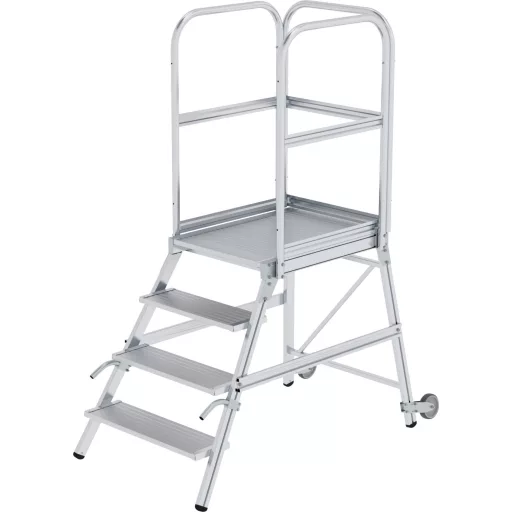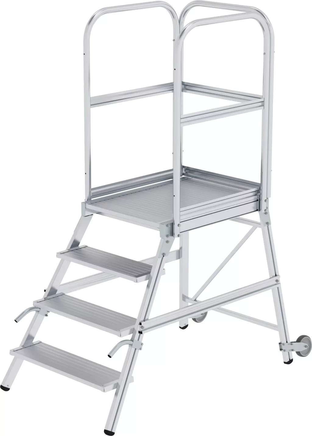 Alumínium talapzatlépcső, az egyik oldalról hozzáférhető Stabil téglalap alakú, cső alakú rudak 200 mm mély lépcsőn Tágas platform (600 x 800 mm) 3 oldalas korlát, térd és alaplap a biztonságos helyzethez Két emelő görgő Ø 125 mm és fogantyúk a könnyebb mozgatáshoz egyik helyről a másikra Könnyű telepítés (Kihúzott szétszerelés) A kapaszkodók a DIN EN 131-7 szerint állnak rendelkezésre a peronlétrák emelkedésekor, ha a emelkedési szög legalább 60 ° vagy opcionális.