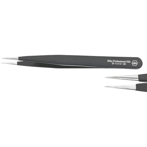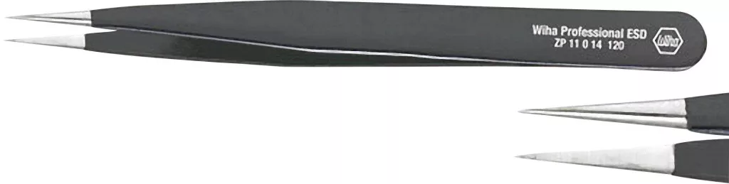 Jellemzők: Szabvány: IEC 61340-5-1 · Csipesz alak: Egyenes középfinom, erős heggyel ·