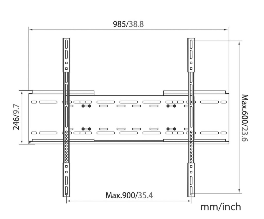 Műszaki adatok: Alkalmas a következő kijelző méretekhez: 127,0 cm (50"), 129,5 cm (51"), 132,1 cm (52"), 134,6 cm (53"), 137,2 cm (54"), 139,7 cm (55"), 142,2 cm (56"), 144,8 cm (57"), 147,3 cm (58"), 149,9 cm (59"), 152,4 cm (60"), 154,9 cm (61"), 157,5 cm (62"), 160,0 cm (63"), 162,6 cm (64"), 165,1 cm (65"), 167,6 cm (66"), 170,2 cm (67"), 172,7 cm (68"), 175,3 cm (69"), 177,8 cm (70"), 180,3 cm (71"), 182,9 cm (72"), 185,4 cm (73"), 188,0 cm (74"), 190,5 cm (75"), 193,0 cm (76"), 195,6 cm (77"), 198,1 cm (78"), 200,7 cm (79"), 203,2 cm (80"), 208,3 cm (82"), 213,4 cm (84"), 215,9 cm (85"), 228,6 cm (90"), 254,0 cm (100") · Anyag: Acél · Gyártói szín: Fekete · Gáznyomásos technológia: Nem · Max. faltól való távolság: 28 mm · Min. faltól való távolság: 28 mm · Méret, magasság: 0.28 cm · Méret, mélység: 60 cm · Méret, szélesség: 98.5 cm · Súly: 4.9 kg · Tartó jellemzők: Lopás elleni védelemmel · Tartó kivitel: Merev · Tartóerő (max.): 100 kg · VESA szabvány: 100 x 100 mm, 100 x 200 mm, 100 x 75 mm, 150 x 100 mm, 150 x 75 mm, 200 x 100 mm, 200 x 200 mm, 200 x 300 mm, 200 x 400 mm, 30 x 30 mm, 300 x 100 mm, 300 x 200 mm, 300 x 300 mm, 300 x 400 mm, 400 x 200 mm, 400 x 300 mm, 400 x 400 mm, 400 x 600 mm, 400 x 800 mm, 440 x 400 mm, 50 x 50 mm, 500 x 350 mm, 500 x 400 mm, 600 x 200 mm, 600 x 300 mm, 600 x 400 mm, 600 x 500 mm, 600 x 600 mm, 600 x 800 mm, 700 x 400 mm, 700 x 450 mm, 75 x 75 mm, 800 x 200 mm, 800 x 400 mm, 800 x 450 mm, 800 x 500 mm, 800 x 600 mm, 900 x 600 mm