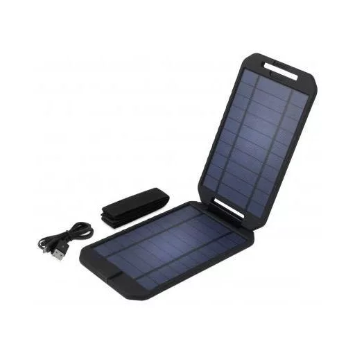 Műszaki adatok: Kimenetek: USB · Kimeneti feszültség: 5 V · Méret (kiegészítő szöveg): Összecsukva · Méret, hossz: 200 mm · Méret, magasság: 15 mm · Méret, szélesség: 114 mm · Szín: Fekete · Súly: 289 g · Technológia: Monokristályos · Teljesítmény, napelem: 5 W · További műszaki adatok: A hossz 396 mm-re kihajtható · Nyílás max. 220° -ig. · Védettség: IP65 · Típus: Napelemes akkutöltő · Töltési csatornák/rekeszek: 1 · Töltőáram (max.): 1000 mA · Töltőáram napelem (max.): 1000 mA