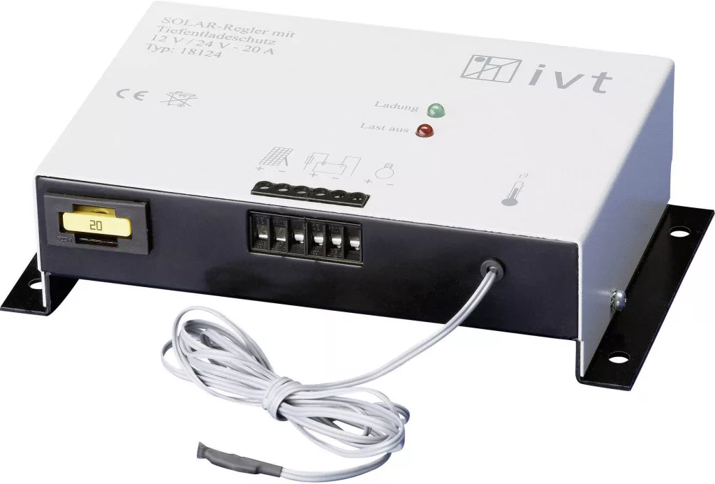 Jellemzők: Beépített hőmérséklet érzékelő · automatikus 12/24 V átkapcsolás · mélykisülés elleni védelem · szabályozási elv: sönt · hőmérséklet kompenzálás.