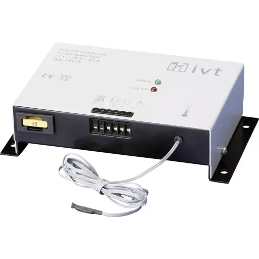 +50 °C · Modul teljesítmény (max.): 240 Wp · Modul áram (max.): 20 A · Méret, magasság: 100 mm · Méret, mélység: 45 mm · Méret, szélesség: 190 mm · Névleges feszültség: 12 V,24 V · Szabályozás típus: PWM · Súly: 300 g · Terhelési áram: 20 A · Termék típus: Napelem töltésszabályozó · Töltőáram (max.): 20 A · Áramfelvét: 4 mA