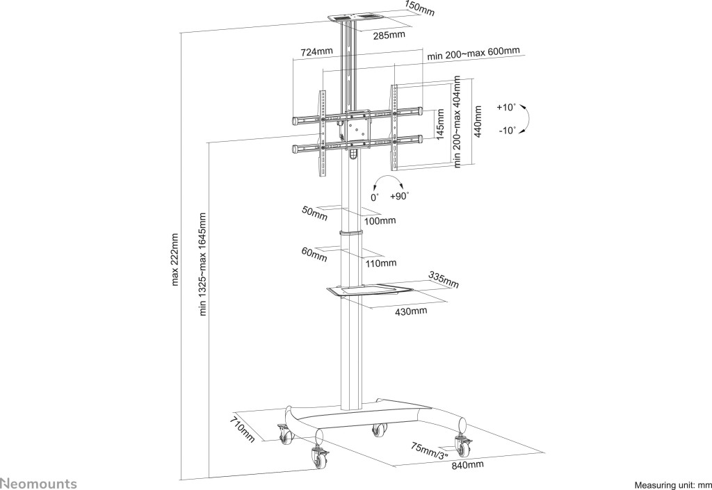 A NewStar PLASMA-M1900E típusú padlóállvány egy mobil padlós állvány sík képernyőkhöz és síkképernyős televíziókhoz 178 cm-ig. Ez a mobil állvány kiváló választás helytakarékos elhelyezéshez, vagy amikor a falra, mennyezetre vagy asztalra történő felszerelés nem választható. Ez a kocsi sokoldalú vetítési lehetőségeivel kibővíti az Ön lehetőségeit azáltal, hogy egy nagy kijelzőt több helyiségbe gördít. Optimális elhelyezkedést biztosít mind álló, mind ülő nézők számára, bármilyen választott helyen. A NewStar dönthető (20 °) és forgatható (90 °) technológiája lehetővé teszi, hogy a rögzítőt bármilyen látószögbe változtassák, hogy teljes mértékben kihasználhassák a síkképernyő lehetőségeit. A tartó magassága kézzel állítható 130 és 162 centiméter között. Egyedülálló kábelvezető rejti el és vezeti a kábeleket a tartótól a síkképernyőig. A NewStars PLASMA-M1900E padlóállványa megtartja a TV-t, az AV berendezéseket, és még a kábeleket is elrejti. A görgők lehetővé teszik, hogy az állványt oda vigye, ahová szüksége van, és könnyedén átguríthatja a kocsit az ajtókon és a küszöbök felett. A NewStar PLASMA-M1900E legfeljebb 178 cm-es képernyőkhöz használható. A termék terhelhetőségét legfeljebb 50 kg-os képernyőhöz tervezték. Az állvány alkalmas VESA 200x200 - 600x400mm lyukmintás képernyőkhöz. A NewStars VESA adapterlemezekkel számos más furatminta fedhető le. Az összes telepítési anyagot a termék szállítja.