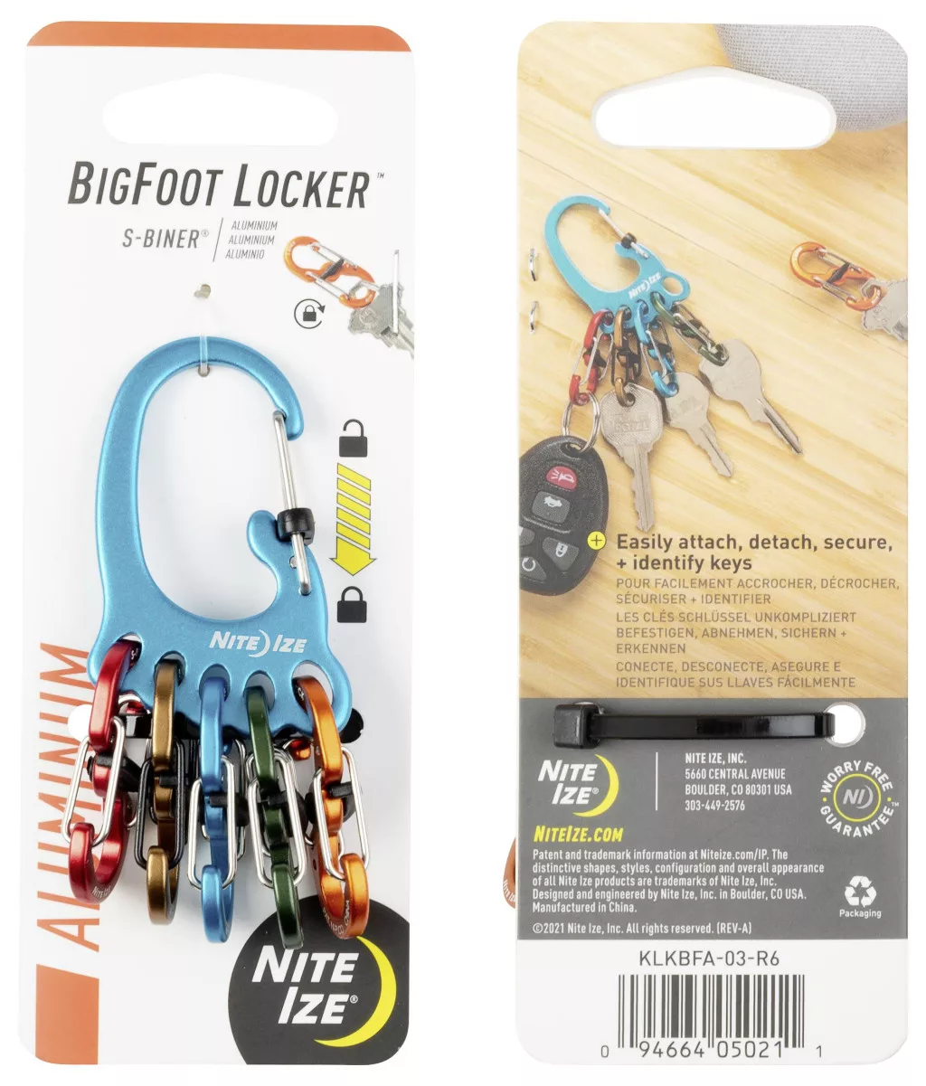 A BigFoot Locker KeyRack a legjobb kulcsmegoldás. A fő test egy integrált SlideLock patenthoroggal rendelkezik, amely könnyen rögzíthető övhurkokhoz, hevederekhez és zárakhoz egy egyszerű csúszkával. A test öntött " lábujjai" öt fényes alumínium S-Biner MicroLock zárat tartalmaznak, amelyek mindegyike akár három kulcs vagy kiegészítő tárolására is alkalmas, és egyszerű elforgatással biztonságosan záródnak. Az egyes S-kulcsok megkülönböztető színei lehetővé teszik a kulcsok egyszerű azonosítását, és könnyen eltávolíthatók a " lábujj" nyílásaiból az egyedi használathoz.