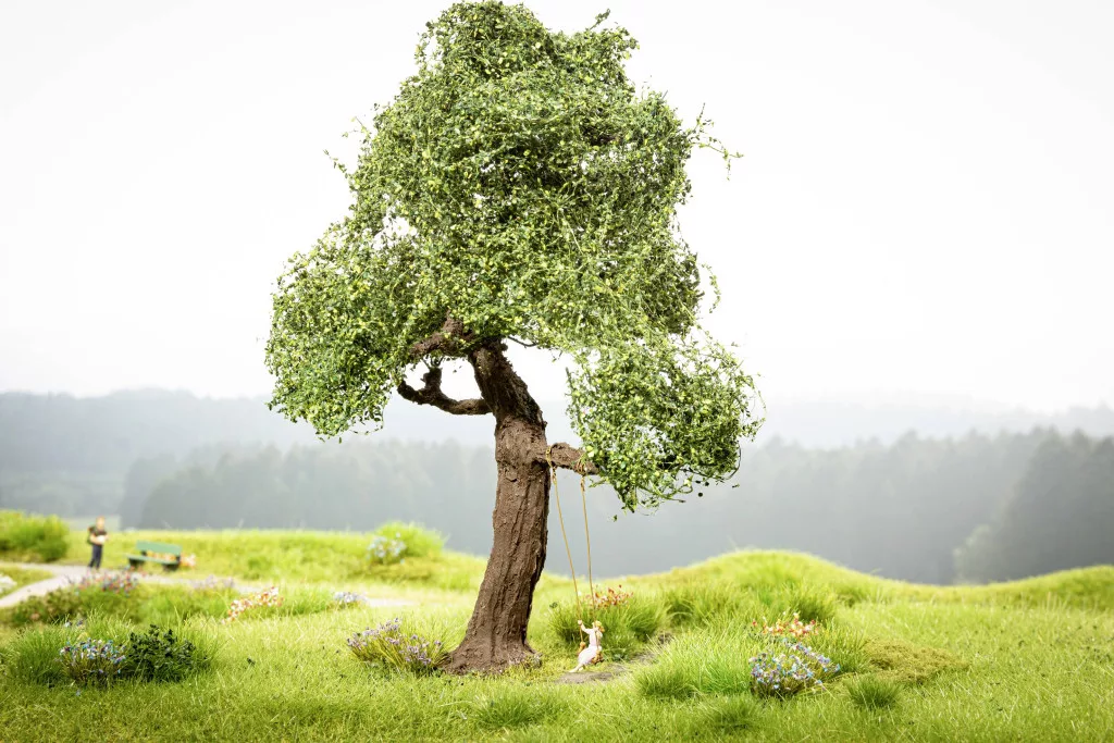 A jelenet, amelyben a "mikro mozgásfát hintával" használjuk, így nézhet ki, vagy hasonló. A hintás fa lenyűgöző mirco-motion termék, és csodálatos gyermekkori emlékeket idéz fel. A hatalmas tölgy legalsó ágán hinta leng egy kislányt. A hintával ellátott fát összeszerelésre készen szállítják. A hajtás motorból és sebességváltóból áll, és a fa alatt helyezkedik el (építési magasság kb. 33 mm). A mellékelt elektronika egy szabványos 16 V-os vasúti transzformátorhoz van csatlakoztatva, és alkalmas egyen- és váltakozó áramra. A ringató mozgás sebessége az áramköri lapon állítható be.