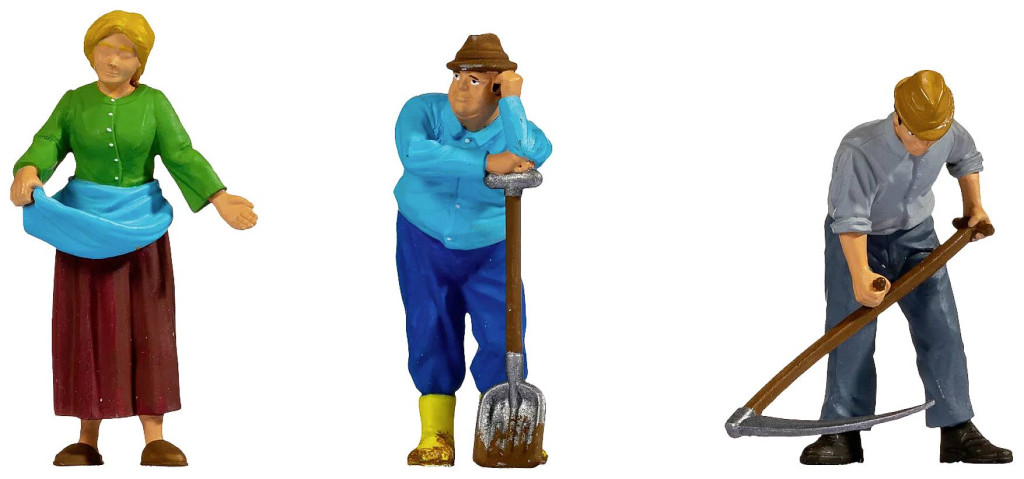 A figurakészlet 3 figurát tartalmaz. Egy farmer diót gyűjt a kék kötényével. Sötétzöld blúzt és a kötény alatt sötétkék szoknyát visel. A haja szőke, egyik kezében a kötényét tartja. Egy gazda hagyományos módon kaszával nyírja a füvet. Hogy nagyobb lendületet kapjon, egy kicsit meghajolt. Kék nadrágot, inget és szalmakalapot visel, hogy megvédje magát a hőségtől. A harmadik gazda kimerülten az ásójára támaszkodik. Csak kiásott valamit. Ezért van rajta sárga gumicsizma. Kék munkanadrágot és világoskék inget visel. Barna kalap van a fején.