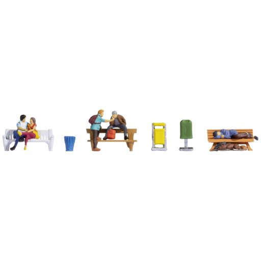 Egy szerelmes pár ül együtt egy padon, a szomszédban pedig két fiatalember beszélget. Amíg a sapkás férfi a pad karfáján ül, és maga elé tette a hátizsákját, a másik férfi egyik lábával a padon támaszkodik, és hátán hordja a hátizsákját. Ide tartozik egy padon alvó hajléktalan is. Minden holmiját egy takaróra tette a pad alatt. A kutyája is itt kapott helyet. Sajnos sok embert még ma is érint a hajléktalanság, és emiatt az utcán kell élniük. A NOCH modellfiguráinak köszönhetően mostantól a valóságnak ezt a részét is reprodukálhatja a modellben, és rendszerét a valóság minden oldalával megtervezheti.