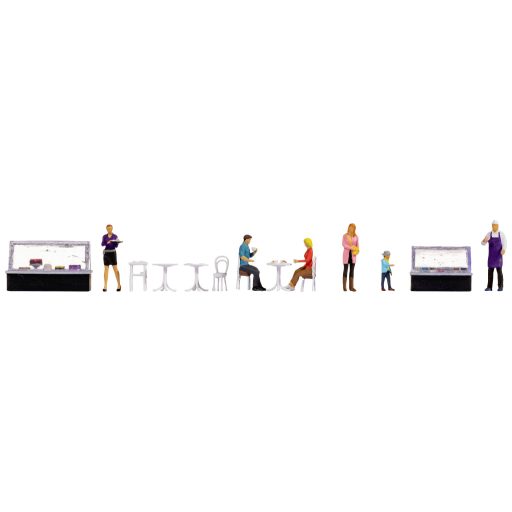 Műszaki adatok: Figurák száma: 6 · Kivitel (általános): Figura témavilág " Cafe" · Megépítési méret: H0 · Modell kivitel (modellvasút): Festett · Téma: Munka közben, Család és szabadidő, Közlekedés
