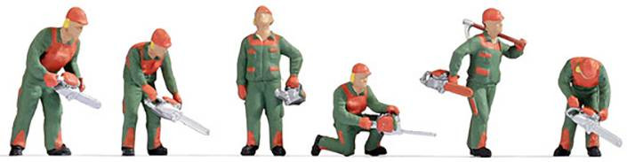 A 6 darab figura fehér-narancssárga védőruhát, valamint narancssárga kemény kalapot és sárga fülvédőt visel. Mindegyikük motorfűrésszel van felszerelve. Semmi sem akadályozza az erdei munkát itt.