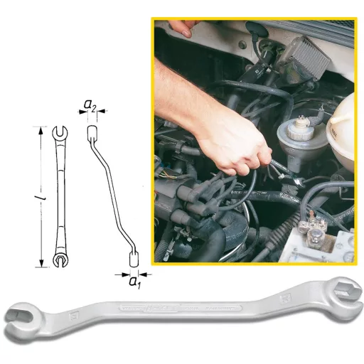 Jellemzők: Fékvezetékek csavarmenetes kötéseihez · Megerősített kivitel · Hajlított · Hatlapú · Egyenesen felhasítva · Króm-vanádium · Felület: krómozott