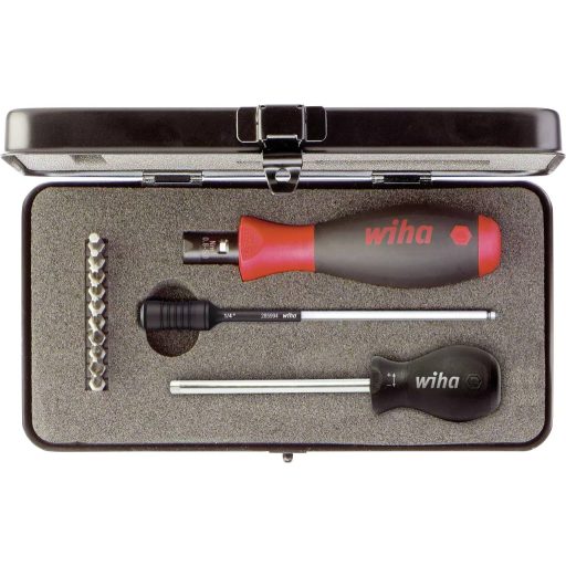13 részes TorqueVario-S nyomaték csavarhúzó készlet fogantyú modellel 1,0-5,0 Nm. Nyomaték fokozatmentesen beállítható a Torque Setter beállító szerszámmal (vele szállítjuk). Ergonomikus többkomponensű nyéllel, különösen kézbe illő, könnyű és kompakt.