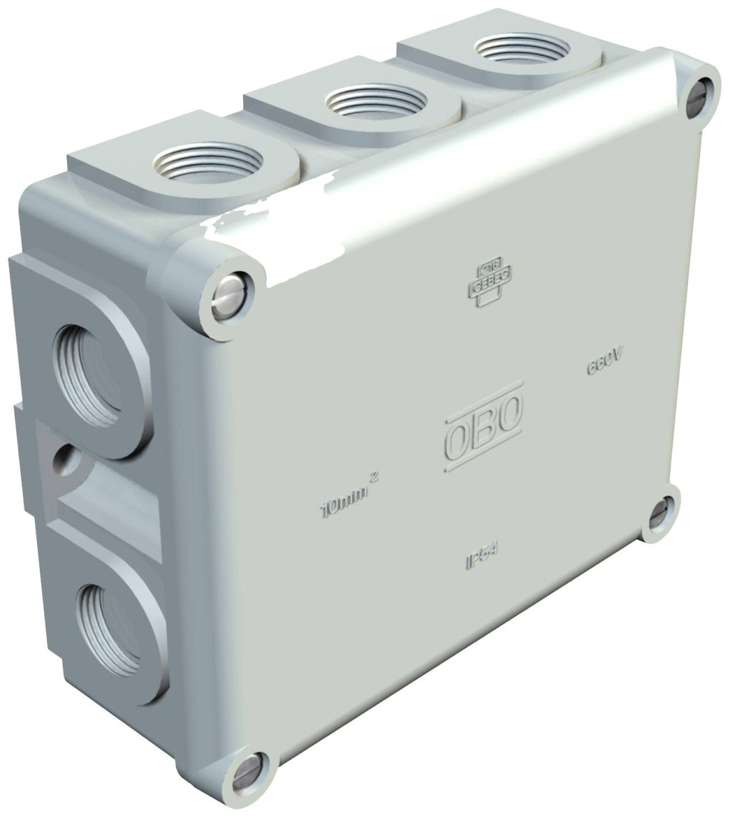 IP54 védettség, névleges feszültség 660 V, névleges keresztmetszet mm², 2 rögzítőnyílás 6 mm-es Ø csavarokhoz a doboz külső részén, 4 fedőcsavar, 10 megszakítási bejegyzés M20 x 1,5 menettel, lehetőleg rövid összekötő menettel ellátott kábelcsatlakozókhoz. Méretek: 136 x 111 x 57 mm Belső méretek: 125x100x44 mm.