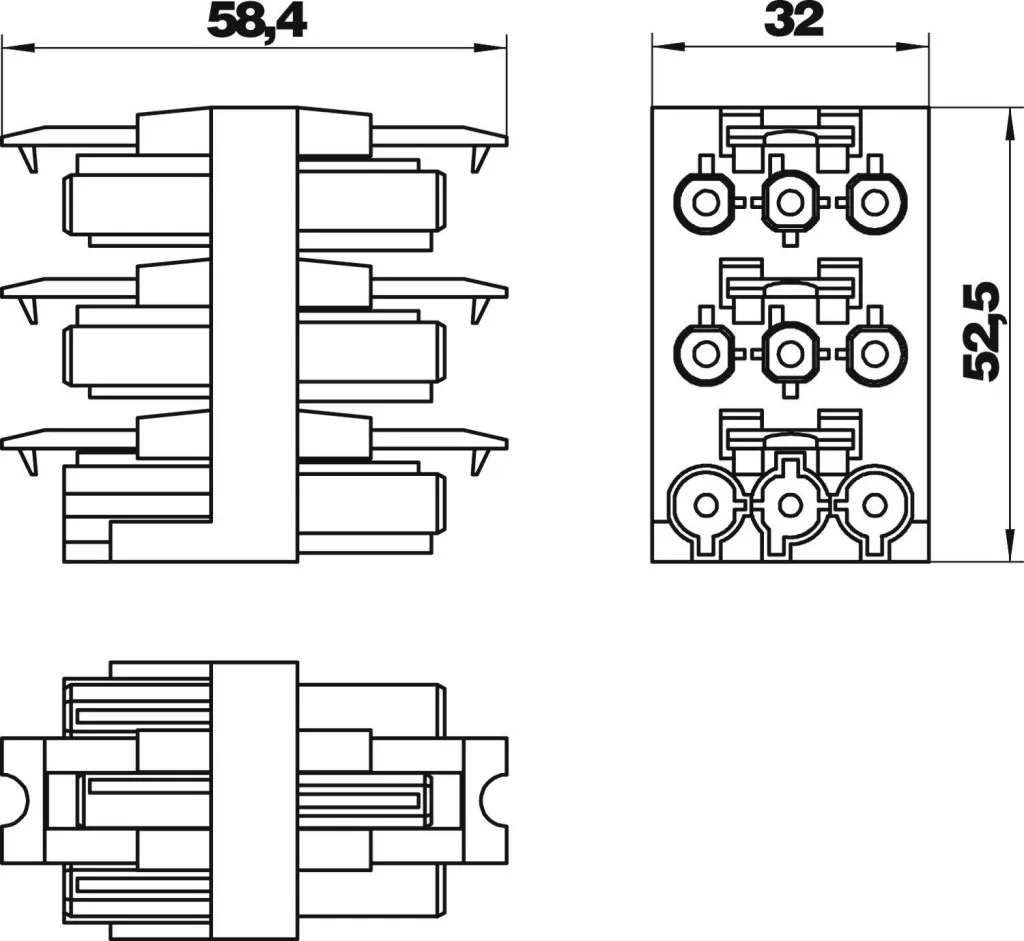 GST18i típusú reteszelőelosztó, 1 bemenet 3-pólusú csatlakozóval és 5 kimenet 3-pólusú női csatlakozóval.