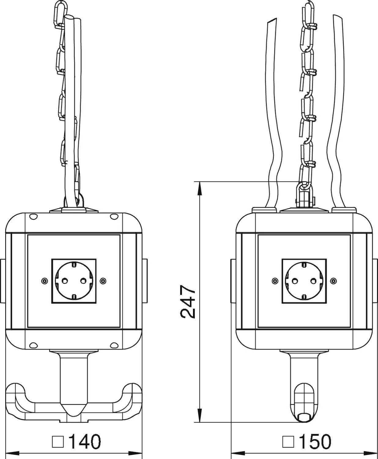A grafit fekete (RAL 9011) házból, függesztett hurokból, fogantyúhorogból és zárt lemezből áll, fedőlemez nélkül, kb. 0,51 kg. 4 fedőlemezzel és 2 3 pólusú csatlakozóval ellátott, SCHUKO 16 A / 250 V csatlakozóaljzattal, két AC áramkörhöz csatlakoztatva.