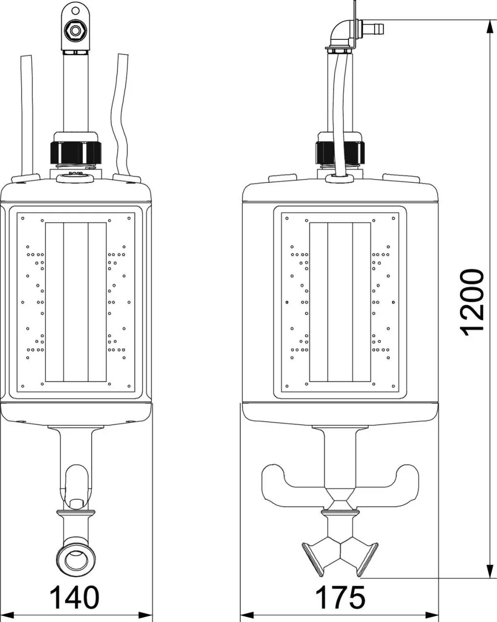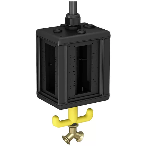 Üres ház függőleges szemmel és fogantyúval, az elektromos berendezések beszereléséhez, zárt válaszfallal. Fedőlemezek nélkül. Nedves területeken történő munkahelyi ellátáshoz, 1 m-es 1/2 "csővel, 13 x 3,5 mm-es sűrített levegő tömlő csatlakozójával és 1/2-es kétirányú elosztóval
