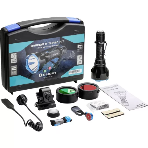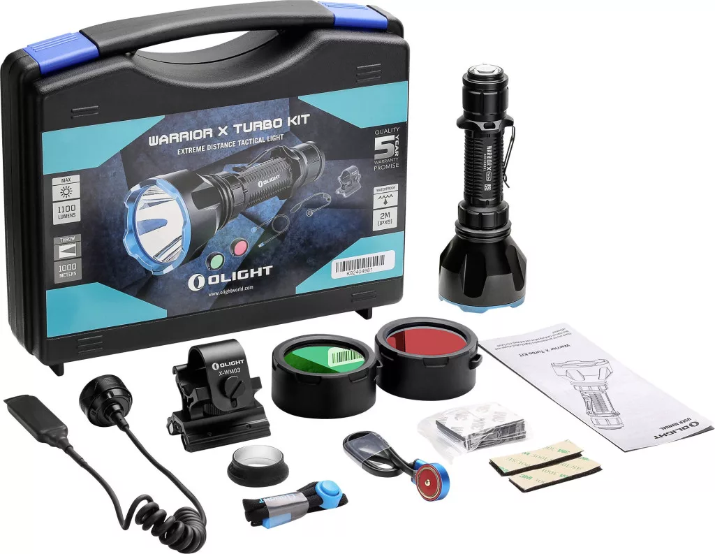 A Warrior X Turbo készlet tartalmazza a Warrior X Turbo taktikai lámpát, egy fegyvertartót, egy távirányító kapcsolót (ROD) és két további szűrőt (zöld és piros).