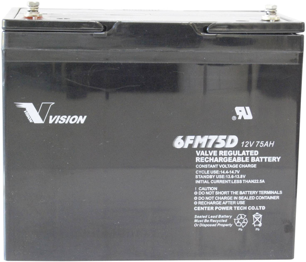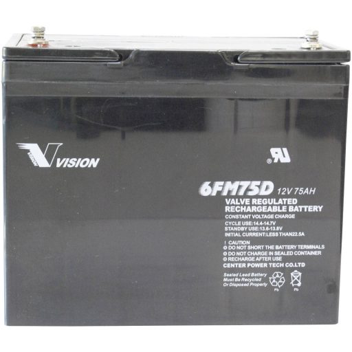 Műszaki adatok: Akku/elem típus: Ólomakku · Elem jellemzők: Karbantartásmentes,Ciklusálló · Elem-/akkutechnológia: Ólom-vlies (AGM) · Feszültség: 12 V · Gyártói szám: 6FM75DX, Vision · Kapacitás (mAh, Ah): 75 Ah · Méret, magasság: 215 mm · Méret, mélység: 166 mm · Méret, szélesség: 258 mm · Súly: 24 kg · További műszaki adatok: Hőmérséklettartomány: -20 ... +60°C · VDS engedély: Nem · Újratölthető: Igen