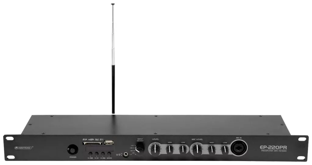 PREAMP MP3 LEJÁTSZÓVAL ÉS FM RÁDIÓVAL Hangerősítés egyszerűSzeretné könnyedén szabályozni étterme, edzőterme vagy üzlete hangerősítését? Legyen az Omnitronic EP-220PR előerősítő az egyszerűen használható vezérlőközpont!