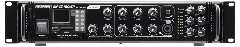 6 zónás PA keverőerősítő audiolejátszóval és IR távirányítóval, állítható zónák, 180 W RMS. ELA hangszórók kényelmes vezérlése 6 zónás technológiával. 6 ELA zónakimenet (100 V), mindegyik 5 fokozatú hangerőszabályzóval. Csatlakozási lehetőség alacsony impedanciájú hangszórókhoz (4-16 ohm). SD kártyanyílás és USB csatlakozó Mappa navigáció és ismétlési funkciók (1. ismétlés, Összes). 2 hátsó mikrofon bemenet (6,3 mm-es jack, aszimmetrikus). 1 előlapi mikrofonbemenet (XLR/6,3 mm-es jack kombináció, aszimmetrikus) az előlapon, állítható prioritási funkcióval. Minden mikrofonbemenet külön hangerőszabályzóval rendelkezik. 3 vonal bemenet (sztereó RCA) külön hangerőszabályzóval. 1 vonalkimenet (sztereó RCA). Gong, kapcsolható. Magas és mély hangszínszabályzók a kimeneti jelhez. 7 számjegyű LED szintjelző. A kimeneti jel fő vezérlője. (19" ) 48,3 cm-es rackbe szerelés 2 egység Rendkívül hatékony légáramlás elölről hátra. A készüléket hőmérséklet-szabályozott ventilátorok hűtik. Olyan alkalmazásokhoz, mint: telepítés éttermek, bárok és szállodák sportközpontok/edzőtermek. Hanglejátszó. IR távirányítóval vezérelhető. LC kijelző.