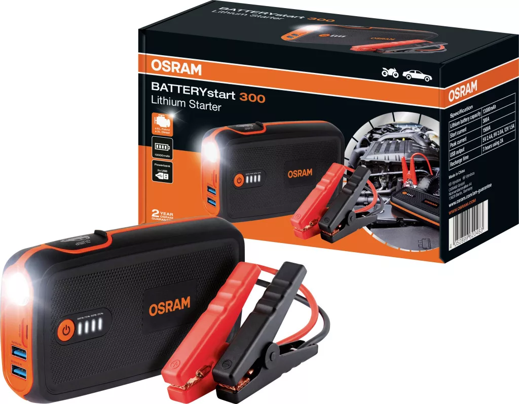 Az OSRAM BATTERYstart300 egy bonyolult és kompakt lítium-kobalt LiCoO2 ugróindító eszköz kis és közepes méretű 12 V-os járművekhez, legfeljebb 6 literes benzinmotorral és 3 literes dízelmotorral. az előadás.