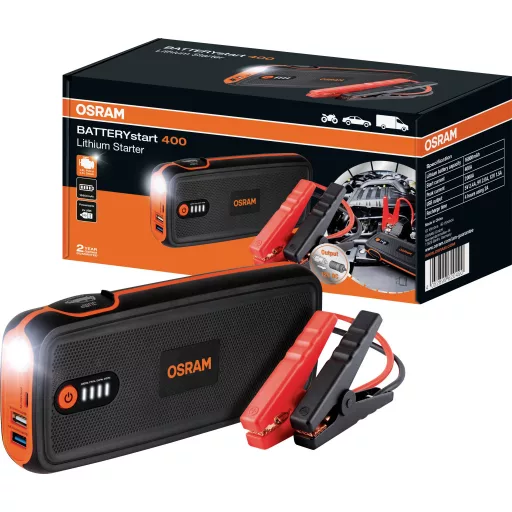 Az OSRAM BATTERYstart400 egy biztonságos és kompakt lítium-kobalt LiCoO2 ugróindító eszköz 12 V-os járművekhez, legfeljebb 8 literes benzin- és 4 literes dízelmotorokkal. Kompakt, a teljesítmény kompromisszuma nélkül: a BATTERYstart400 súlya mindössze 700 g, és könnyedén beilleszkedik autója kesztyűtartójába. Ez megkönnyíti a vészhelyzetben történő alkalmazást.