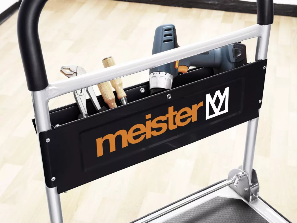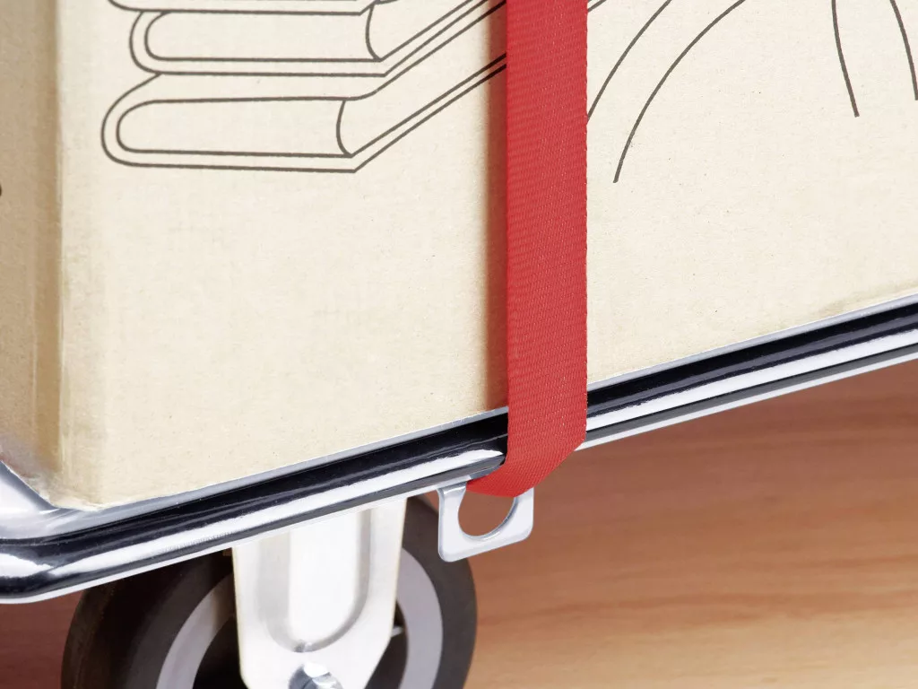 Jellemzők: 2 vezetőgörgő rögzítő fékekkel · Tároló rekesz az irányító karban · 6 füllel a rakományt biztosító hevederes rögzítéshez · Összecsukható.