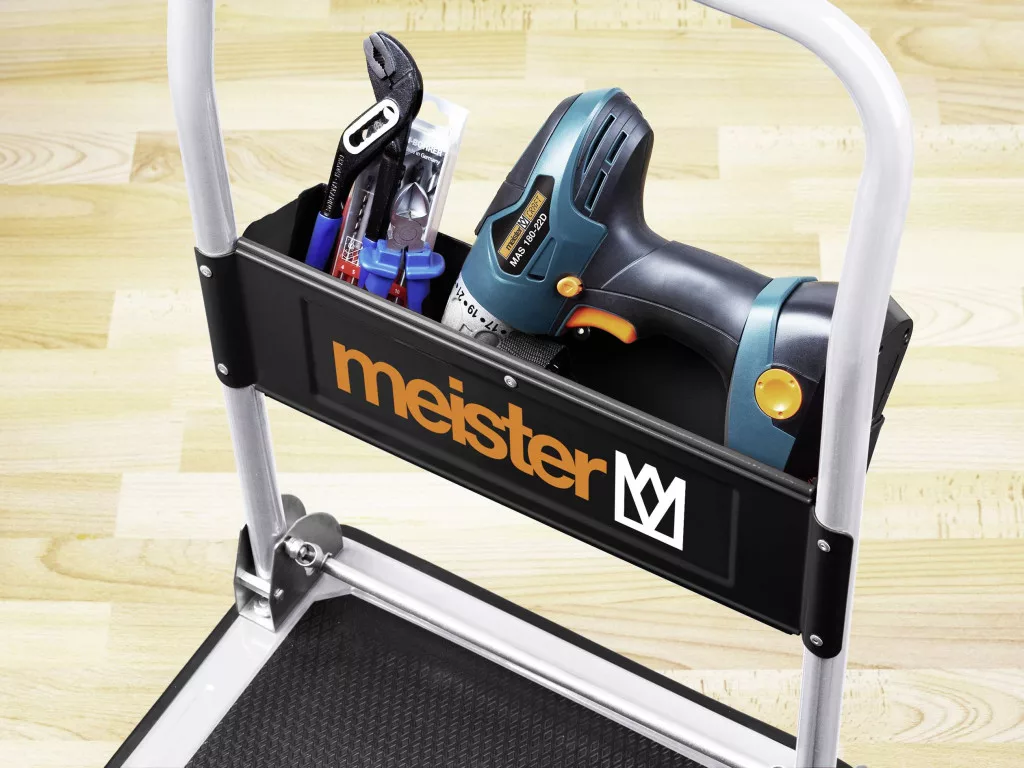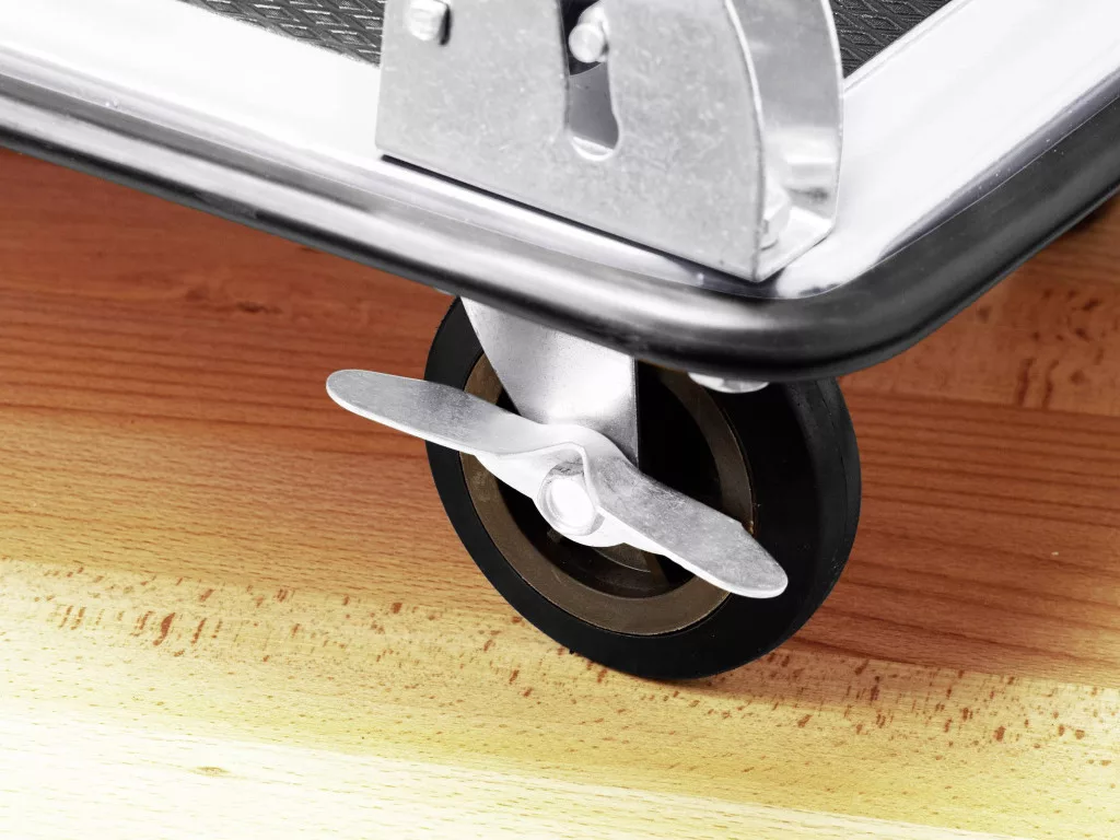 Jellemzők: Összecsukható · Csúszásgátló bevonattal · 2 irányítható kerék, rögzítő fékkel · 6 rakományrögzítő füllel · Tároló rekesz az irányító karban