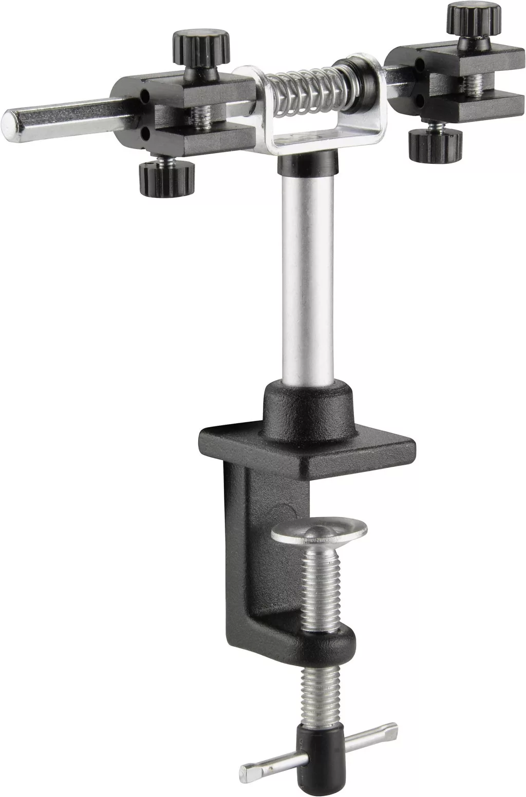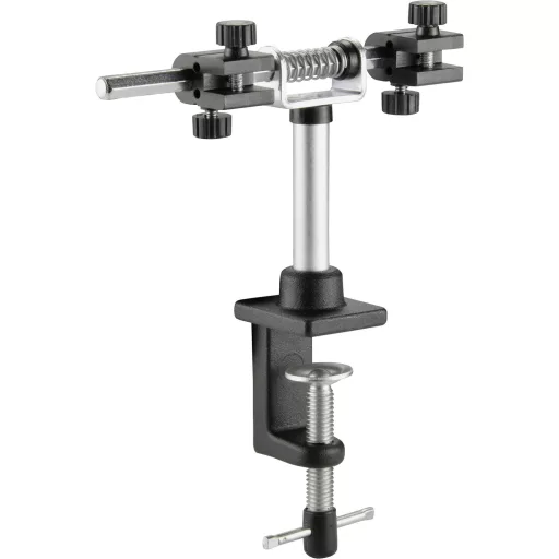A profi nyomtatott lap tartó alumíniumból készült, barkács- és profi munkákhoz, 2 eltolható tartóval kis és nagy lapok számára, rögzítőcsavarokkal minden lapvastagsághoz. 360°-kal elfordítható, 270°-ig dönthető és egy asztali szorítóval rögzíthető.