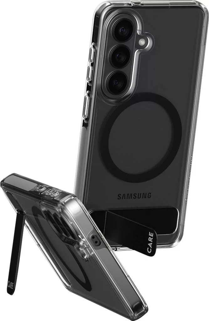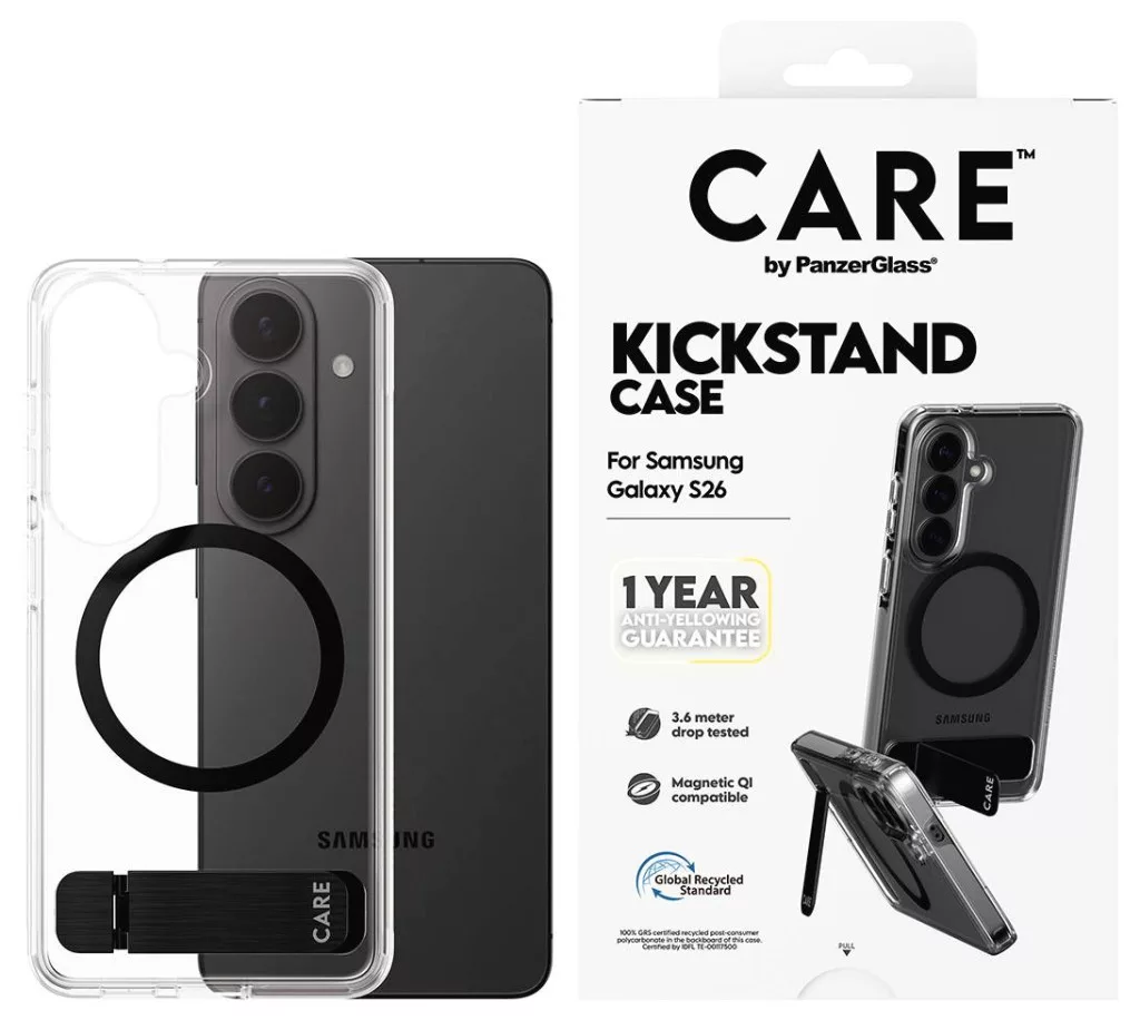 CARE by PanzerGlass Urban Explorer tok, átlátszó, kihajtható állvánnyal/Qi-val, Galaxy S26 készülékhez