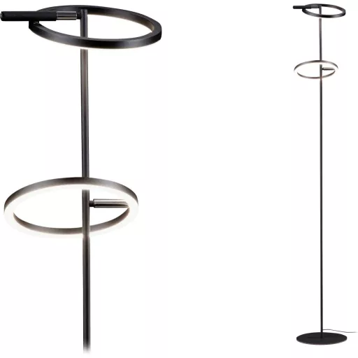 A modern Odila állólámpa matt fekete és króm kivitelben univerzálisan alkalmazható, és a magas funkcionalitást a kifinomult dizájnnal ötvözi. Számos belsőépítészeti stílusba illik, és elegáns, mégis egyszerű megjelenésével lenyűgöző. Az állólámpa fényereje szükség szerint folyamatosan szabályozható, így bármikor tökéletes hangulatot teremthet. Az intelligens, állítható fehér fényszabályozásnak köszönhetően a fény színe a lámpán található érintőkapcsoló segítségével egyénileg állítható 2700K és 6500K között. Ez a rugalmasság teszi őket tökéletes társává számos alkalmazásban – a nappaliban vagy a hálószobában meghitt, meleg fehér fénytől az otthoni irodában uralkodó ideális, nappali fényhez hasonló világításig. A mozgatható fénygyűrűk rugalmasan beállíthatók az alkalmazástól függően. 1200 lumen fényerejével nagy fényáramot biztosít, míg a szatén diffúzor káprázásmentes világítást hoz létre.