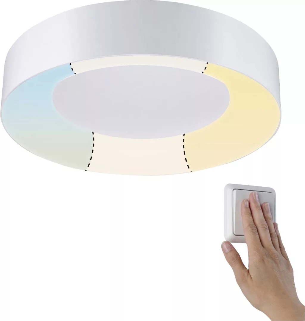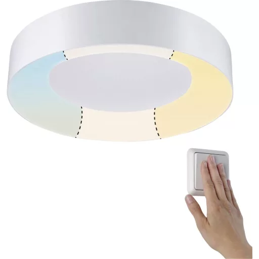 Műszaki adatok: 2021-es energiahatékonysági osztályok: n.rel. · Fényesség (max): 6500 K · Fényforrások száma: 1 · Fényforrással: Igen · Fényszín: 3000 K · Fényszín (fényforrás): Melegfehér · Fényszín (min.): 3000 K · Fényáram összesen: 3200 lm · Gyártói szín: Fehér · Helyiség: Dolgozószoba, Nedves helyiség, Ház/garázs, Gyerekszoba, Konyha, Hálószoba, Nappali/étkező · Méret, magasság: 71 mm · Teljesítmény fényforrásonként: 23 W · Védelmi osztály: II · Védelmi típus: IP44 (mennyezetre szerelhető) · Átmérő: 400 mm · Üzemi feszültség: 230 V