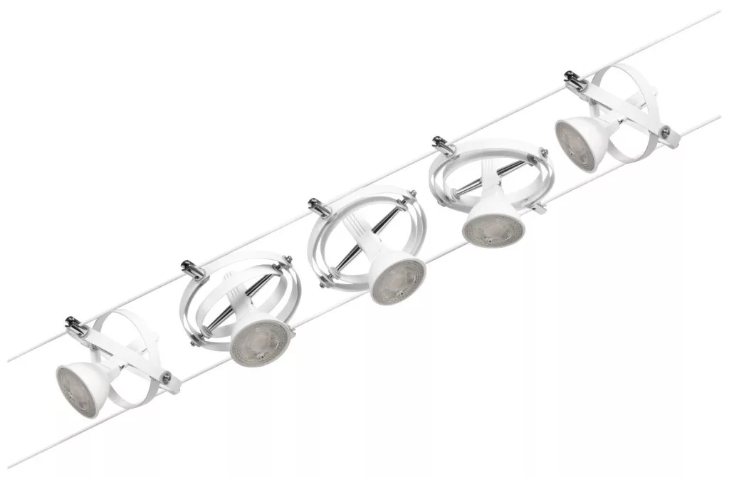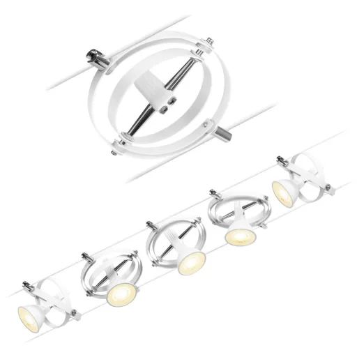 Műszaki adatok: 2021-es energiahatékonysági osztályok: n.rel. · Foglalat: GU5.3 · Fényforrások száma: 5 · Gyártói szín: Fehér (matt), Króm · Helyiség: Dolgozószoba, Gyerekszoba, Konyha, Hálószoba, Nappali/étkező · Kötél távolság: 160 mm · Kötélhossz: 10 m · Védelmi osztály: II · Üzemi feszültség: 230 V