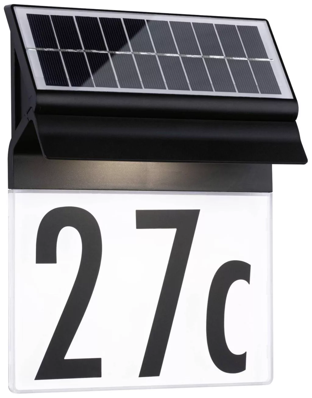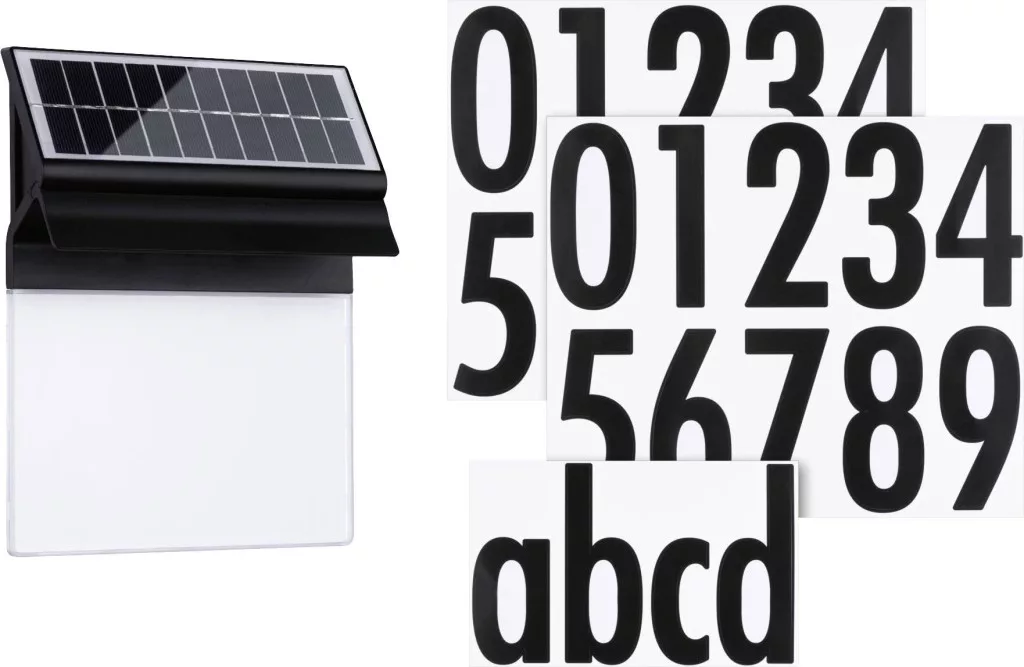 A kültéri napelemes házszámlámpa IP44-es védettségének köszönhetően speciálisan védett a nedvesség és a por behatolása ellen. A praktikus napelemes technológiának köszönhetően a telepítéshez nincs szükség elektromos csatlakozásra. Az akkumulátor napközben töltődik a napsugarak hatására, majd világítással újra kibocsátja a tárolt energiát. Teljesen feltöltött akkumulátorral a lámpa akár 3 napig világítja meg a házszámot. A dekoratív szemrevaló emellett megkönnyíti a látogatók vagy a postás számára a megfelelő házszám keresését a sötétben. A mellékelt, sima fekete színű szám- és betűkészletekkel a kívánt számkombináció egyenként is felragasztható a lámpára.