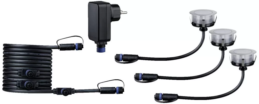 A kerek, 70 mm átmérőjű, süllyesztett Plug & Shine Floor spotlámpák dekoratív fénypontokat biztosítanak az utak vagy teraszok szélén. Ez az indítókészlet három lámpát, egy dugaszolható transzformátort és egy csatlakozókábelt tartalmaz csatlakozóaljzatokkal. A beépített LED modulok igény szerint színes vagy fehér fényt biztosítanak. A színbeállítások a Zigbee-n keresztül végezhetők el. Így nincs szükség további vezérlőkre, például a Plug & Shine Controllerre. A spotlámpák ideálisak fából készült teraszokba való beépítéshez.