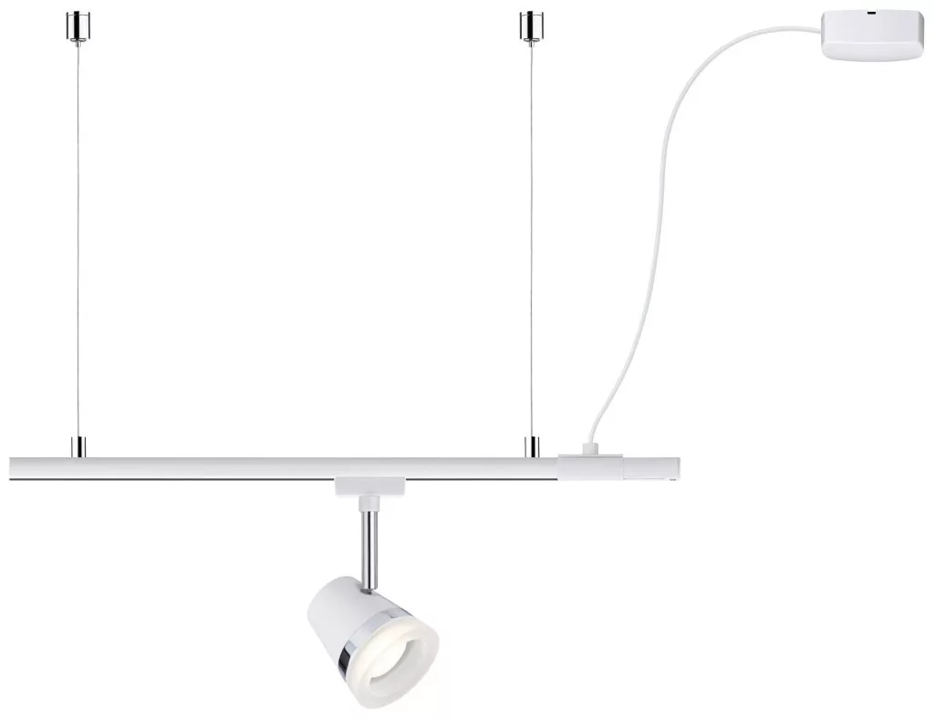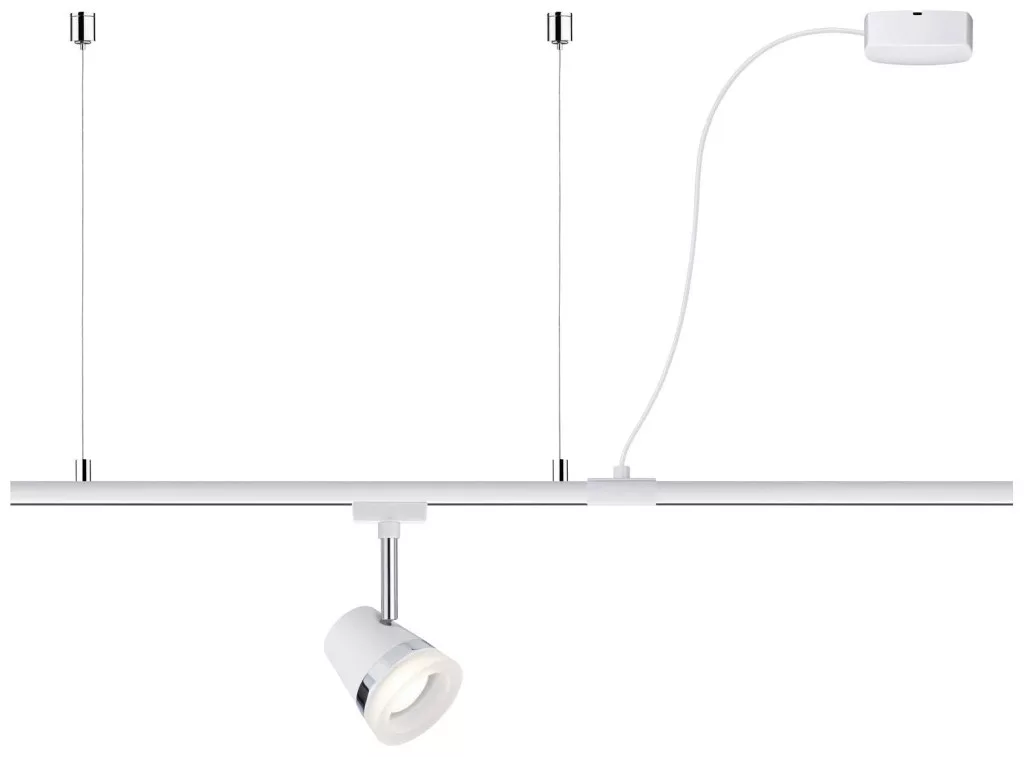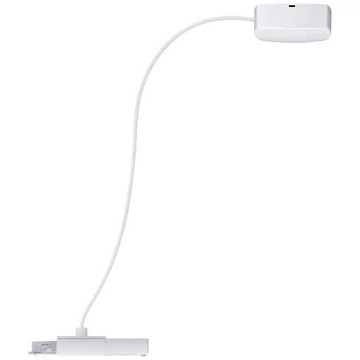 A fehér színű 230 voltos függesztett előtolás könnyű telepítést tesz lehetővé akár 2 m-es felfüggesztett rendszerekhez. Ez lehetővé teszi a magas mennyezetre történő felszerelést, mivel a fényforrás mélyebben elhelyezhető a helyiségben. A vasúti rendszeren keresztüli helyiségtervezés rugalmassága nem vész el. Javasoljuk, hogy építsen legalább egy L alakot a sínelrendezéshez, jobb esetben Z vagy U alakot. Ellenkező esetben csak forgásszimmetrikus lámpatestek lehetségesek, különben a kötélen a sín megdől.