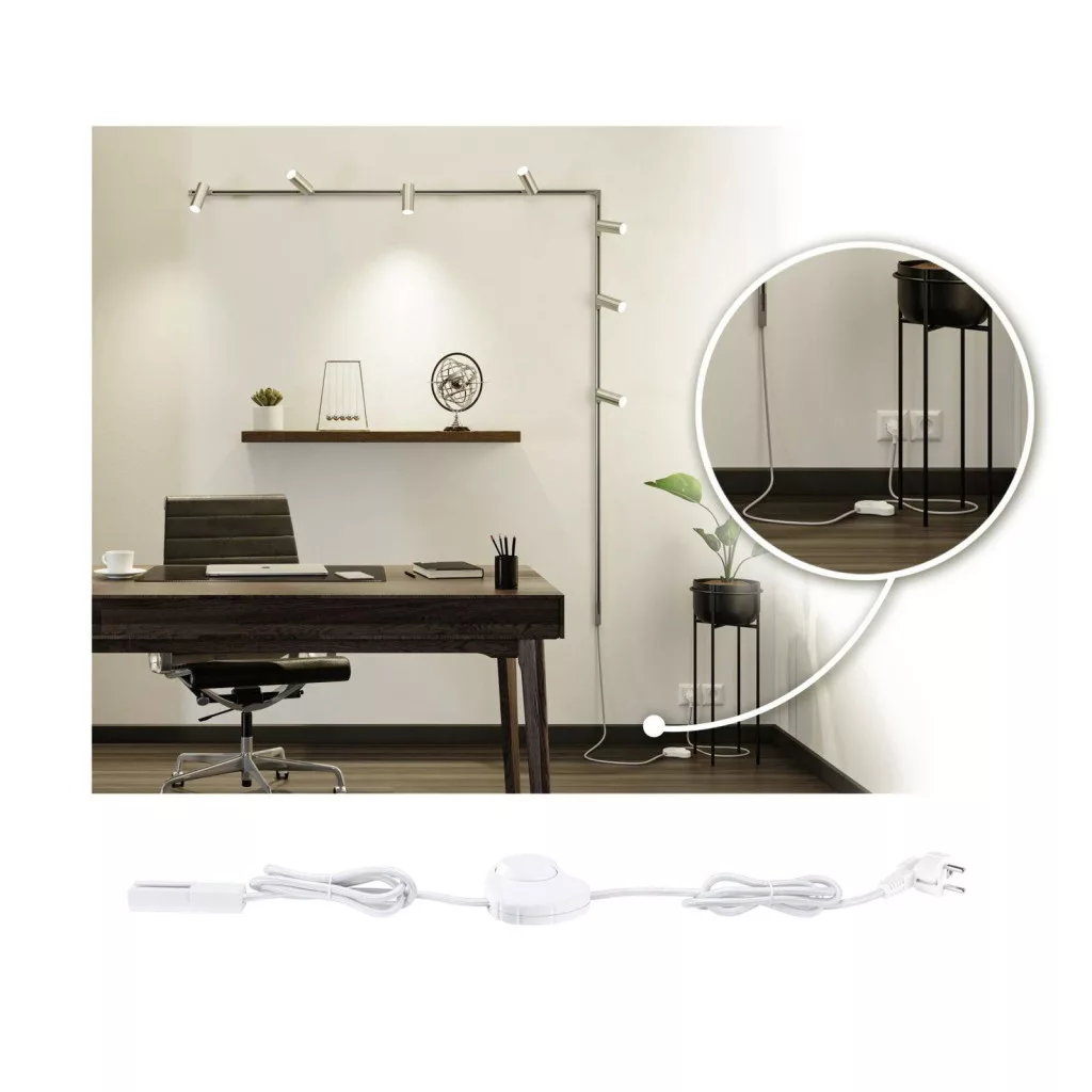 Az URail betáplálás matt króm kapcsolóval új módot teremt a falak ragyogására. Az URail sínrendszer mennyezetre és falra is felszerelhető. Ez a megoldás tökéletes helyiségvilágítást biztosít, és könnyen telepíthető. A sínrendszer minimalista kialakítása zökkenőmentesen illeszkedik bármilyen környezetbe. Az Euro csatlakozóval, kábellel és kábelkapcsolóval ellátott kábelelvezetésnek köszönhetően a lámpák a padlóhoz közeli aljzatokon keresztül a falra rögzíthetők. Vízszintes és függőleges falra egyaránt alkalmazható. Függetlenül attól, hogy nappaliról, dolgozószobáról vagy hálószobáról van szó, a kapcsolós URail tápegység tökéletes megoldást kínál a légköri világításhoz. A tápkábel több mint 210 cm-re nyúlik a csatlakozótól a kapcsolóig, és több mint 30 cm-re a kapcsolótól a sínig.
