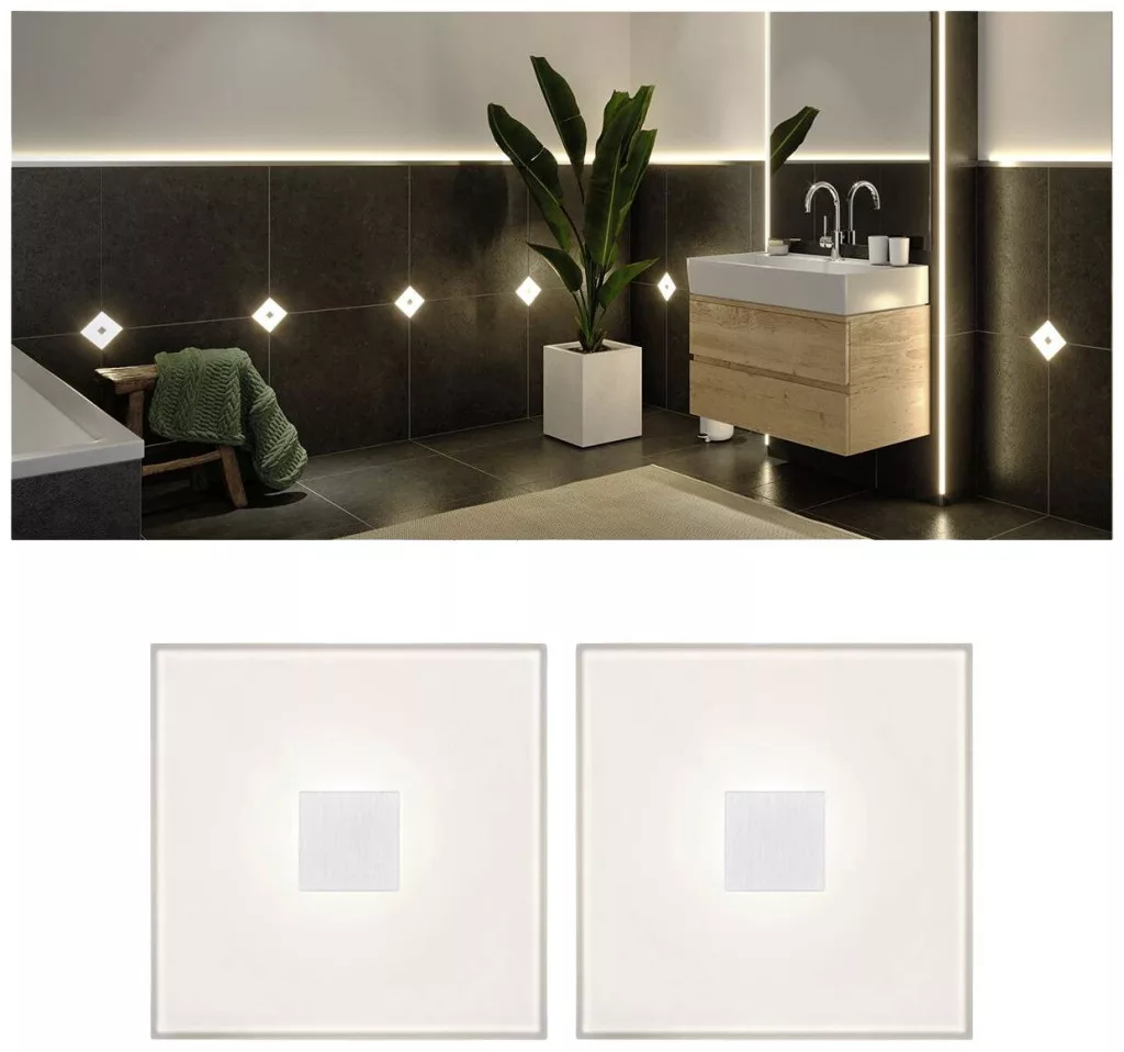 A hatékony, 100x10mm-es LumiTiles LED négyzet alakú alapkészlet 2x0,8W teljesítménnyel két lapkából, egy csatlakozókábelből (hossz: 60 cm) és egy transzformátorból áll a csatlakozással együtt. Az IP44-es védettség ellenére a meleg fehér LED burkolólapok minimális beépítési mélysége mindössze 10 mm, így a szabványos fali csempék közé illeszkednek. A modulok vagy közvetlenül csatlakoztathatók egymáshoz a Plug & Play segítségével, vagy egy kábellel 25, 65, 105 vagy 205 cm-es távolságban csatlakoztathatók. A Paulmann LumiTiles rendszer minden projekthez alkalmas óriási rugalmasságának, egyszerű telepítésének és extra hosszú élettartamának köszönhetően. Az alapkészlet kiegészíthető további LED csempével és csatlakozó kábelekkel.