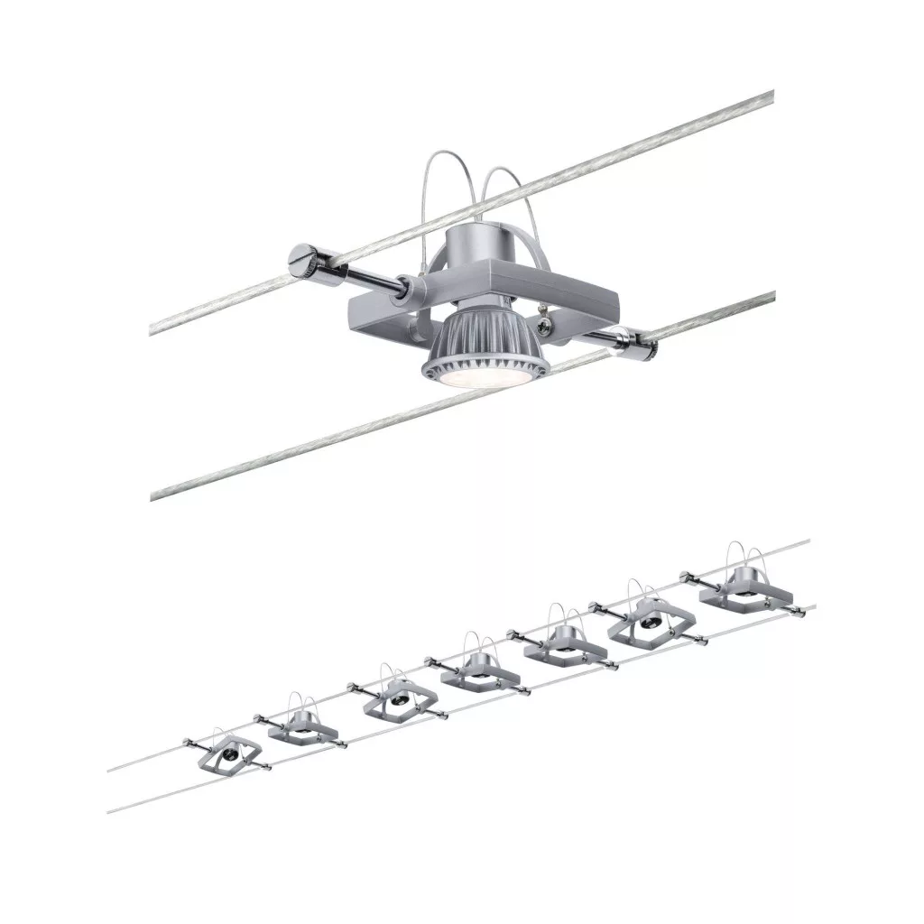 Technical specifications: 2021-es energiahatékonysági osztályok: n.rel. · Anyag: Fém · Design (lights): #####Industriell · Foglalat: GU5.3 · Fényforrás típus: LED (egyszínű) · Fényforrások száma: 7 · Kimeneti teljesítmény (VA): 60 VA · Kötél távolság: 16 cm · Kötélhossz: 10 m · Lámpa jellemzők: Dimmelhető,Dönthető,Falra szerelhető · Space (lights): Nappali/étkező · Szín: Króm (matt) · Teljesítmény: 70 W · Teljesítmény fényforrásonként: 10 W · További műszaki adatok: Fesztáv: 5 m · Védelmi osztály: II · Védelmi típus: IP20 · Üzemi feszültség: 12 V