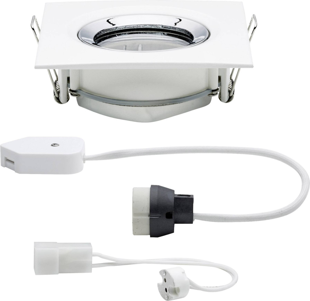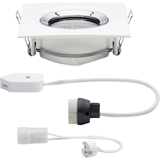 Műszaki adatok: 2021-es energiahatékonysági osztályok: n.rel. · Anyag: Alumínium, Cink · Beépítési mélység: 60 mm · Beépítési átmérő: 83 mm · Foglalat: GU10, GU5.3 · Forgási tartomány, max.: 30 ° · Fényforrás típus: Halogén · Fényforrások száma: 1 · Fényforrással: Nem · Gyártói szín: Fehér (matt), Króm · Helyiség: Fürdőszoba, Nedves helyiség · Kivitel (lámpa): Szögletes · Külső hossz: 9.3 cm · Külső szélesség: 93 mm · Lámpa jellemzők: Dönthető, Dimmelhető · Stílus: Modern/dizájn · Súly: 443 g · Teljesítmény: 35 W · Teljesítmény fényforrásonként: 35 W · Védelmi osztály: III · Védelmi típus: IP65 · Védőüveg: átlátszó · Üzemi feszültség: 230 V