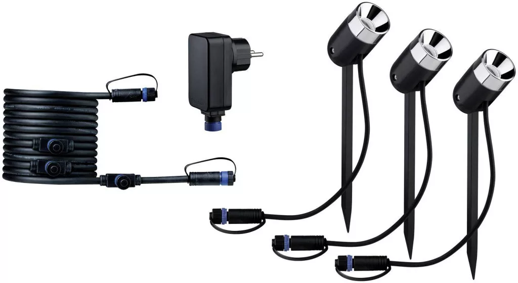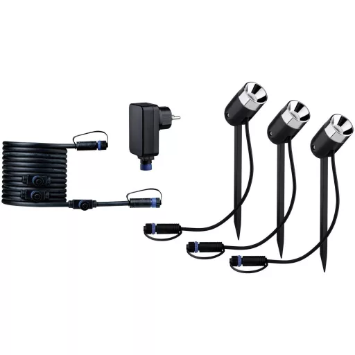 Műszaki adatok: Akku: Nem · Anyag: Műanyag · Energiahatékonysági osztály: nem relatív · Foglalat: Fixen beépített LED-es · Fényforrás típus: LED · Fényforrások száma: 3 · Fényszín: Melegfehér · Fényáram összesen: 720 lm · Fényáram/fényforrás (lumen): 240 lm · Kivitel: Kerek · Lámpa jellemzők: Dimmelhető,Dönthető,Leszúró cövekkel · Méret, magasság: 31 cm · Méret, mélység: 8 cm · Napelemes világító rendszer elemek: LED-es kerti fényszóró kezdőkészlet · Sugárzási szög: 45 ° · Szín: Antracit · Tartalom: 3 db · Teljesítmény: 10.5 W · Teljesítmény fényforrásonként: 3.5 W · Termék típus: Világításrendszer, Plug & Shine · Védelmi osztály: II · Védelmi típus: IP65 · Átmérő: 5 cm · Üzemi feszültség: 24 V