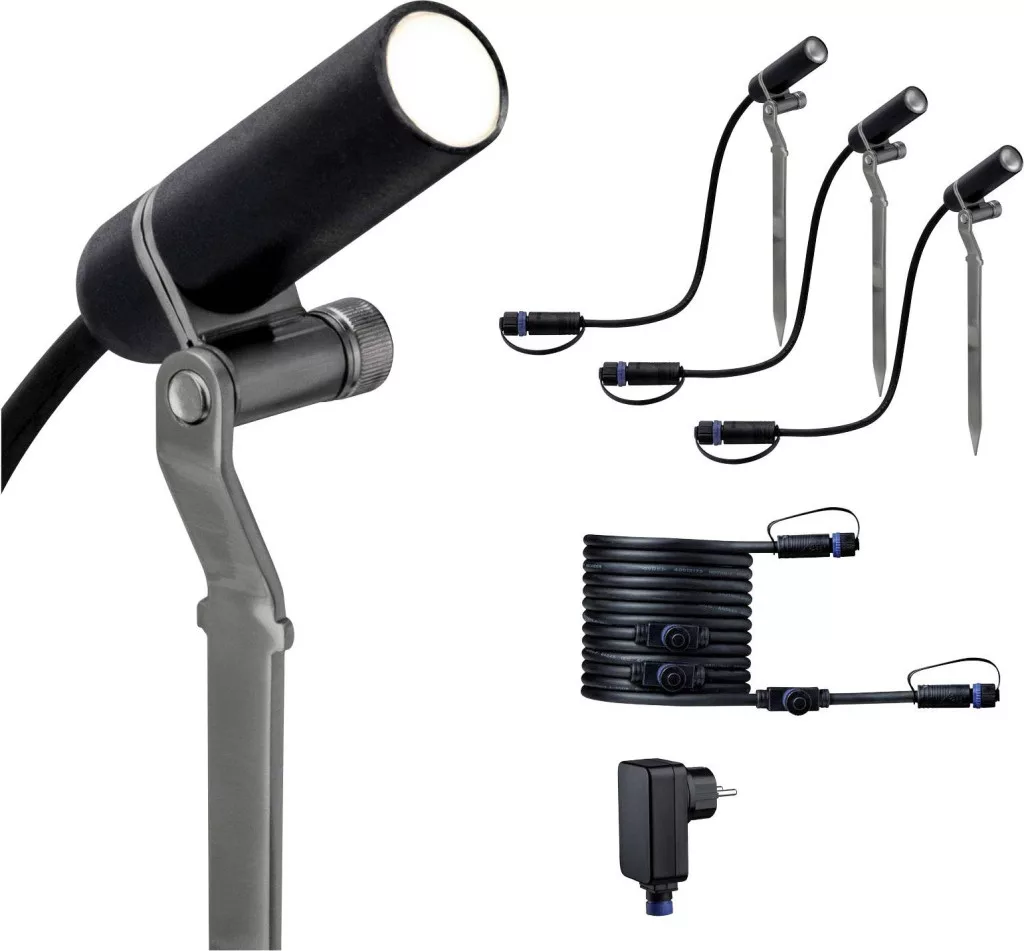 Műszaki adatok: 2021-es energiahatékonysági osztályok: n.rel. · Anyag: Műanyag · Foglalat: Fixen beépített LED-es · Fényforrás típus: LED · Fényforrások száma: 4 · Fényáram összesen: 360 lm · Fényáram/fényforrás (lumen): 90 lm · Gyártói szín: Antracit · Helyiség: Járda megvilágítás, Hangulatos kertvilágítás, Terasz/ülősarok, Cél világítás · Lámpa jellemzők: Dimmelhető, Dönthető, Leszúró cövekkel · Méret, magasság: 22.3 cm · Méret, szélesség: 7.7 cm · Napelemes világító rendszer elemek: LED-es kerti fényszóró kezdőkészlet · Stílus: Modern/dizájn, Fiatal lakás · Sugárzási szög: 45 ° · Teljesítmény: 10 W · Teljesítmény fényforrásonként: 2.5 W · Védelmi osztály: III · Védelmi típus: IP65 · Üzemi feszültség: 24 V