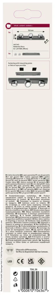 A funkcionális LED-es szekrényvilágítás - Forgatás - optimálisan megvilágítja a munkafelületeket, a szekrényeket és a polcokat elforgatható pontjaival - akár a konyhában, az irodában vagy a műhelyben. A lámpatest egy rögzítőlapra tolódik, amely két csavarral vagy tépőzáras fúrás nélkül van rögzítve. Ez lehetővé teszi a hat AAA elem cseréjét. A lámpát egy kapcsolóval lehet be- és kikapcsolni, és két előre beállított fényerővel tompíthatja.