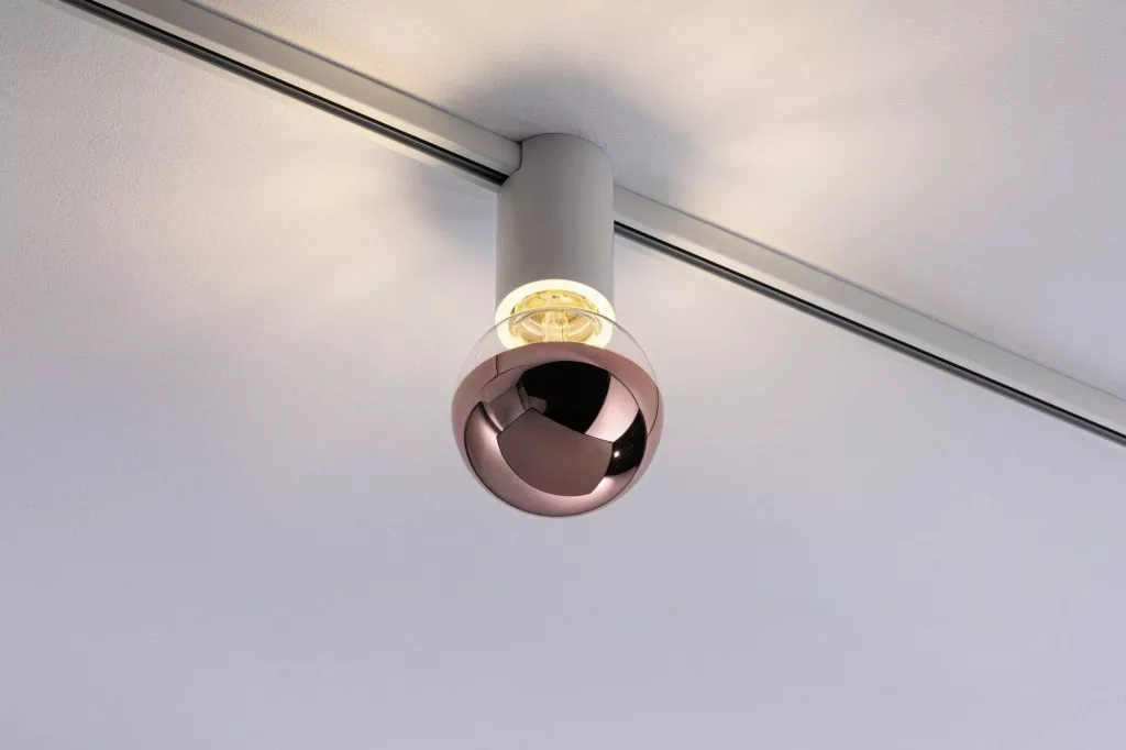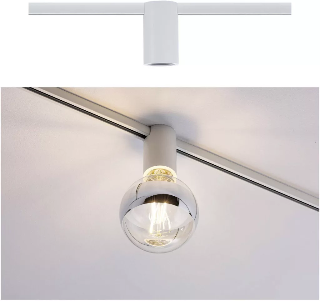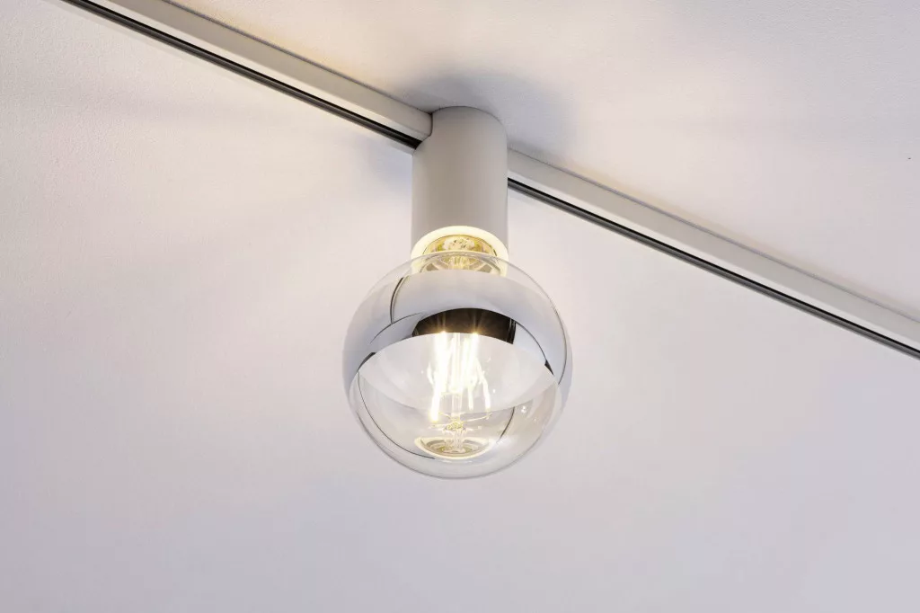 A fehér színű URail Spot mennyezeti aljzat különösen alkalmas dekoratív fényforrásokkal, például fénytükörrel és izzólámpákkal való kombinációra. A belső E27 foglalat és a síntartó láthatatlanul eltűnik egy fém burkolat mögött.