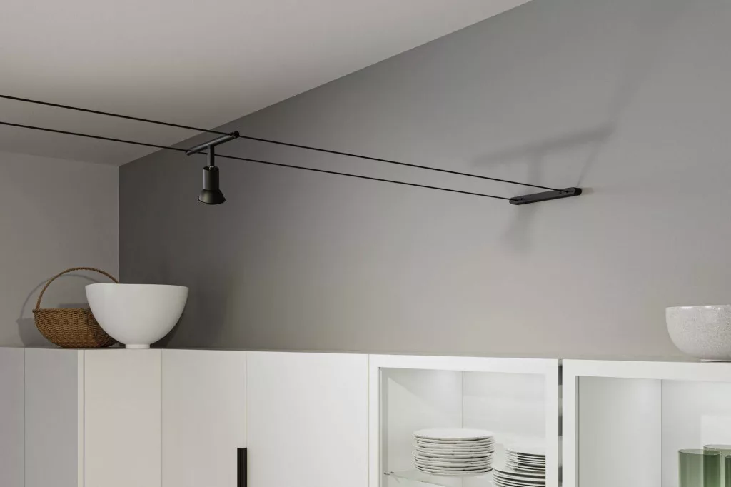 A fekete szorítószerelvény-készlet a falra merőlegesen futó kábelek felszerelésére szolgál. A tok belsejében csavaros mechanizmus található. Itt a kötelet csavarokkal rögzítik, és amikor a mechanizmust elfordítják, egy kötelet behúznak. A másik kötelet ezután az ellenkező oldalon kifeszítik. A készlettel és a többi komponenssel speciális igényeknek megfelelő kábelrendszer alakítható ki. Modern, lineáris kialakításának köszönhetően bármilyen berendezési stílushoz illik!