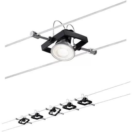 Műszaki adatok: 2021-es energiahatékonysági osztályok: n.rel. · Foglalat: GU5.3 · Fényforrás típus: LED · Gyártói szín: Fekete (matt) · Helyiség: Dolgozószoba, Gyerekszoba, Konyha, Hálószoba, Nappali/étkező · Kötél távolság: 160 mm · Méret, hossz: 10 m · Üzemi feszültség: 230 V