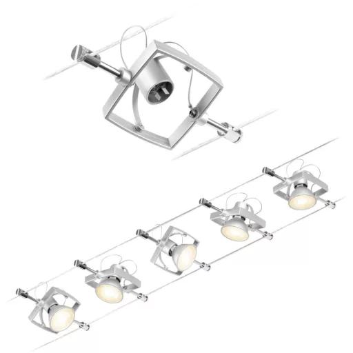 Műszaki adatok: 2021-es energiahatékonysági osztályok: n.rel. · Foglalat: GU5.3 · Fényforrások száma: 5 · Gyártói szín: Króm (matt) · Helyiség: Dolgozószoba, Gyerekszoba, Konyha, Hálószoba, Nappali/étkező · Kötél távolság: 160 mm · Kötélhossz: 10 m · Védelmi osztály: II · Üzemi feszültség: 230 V